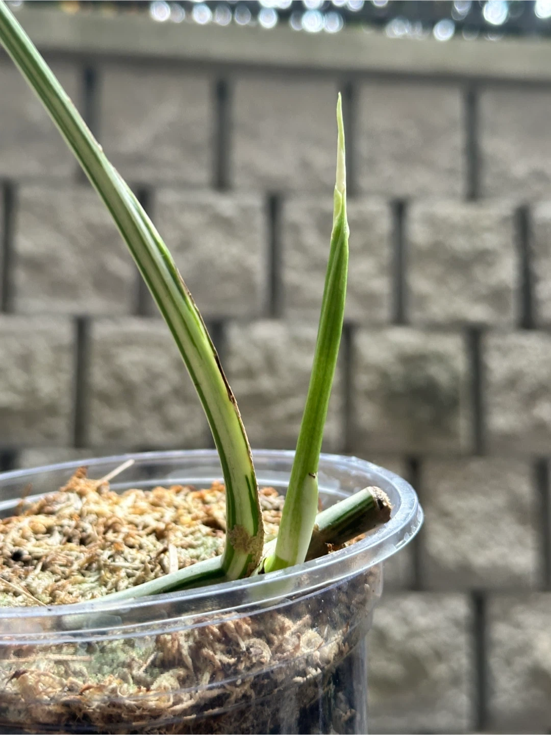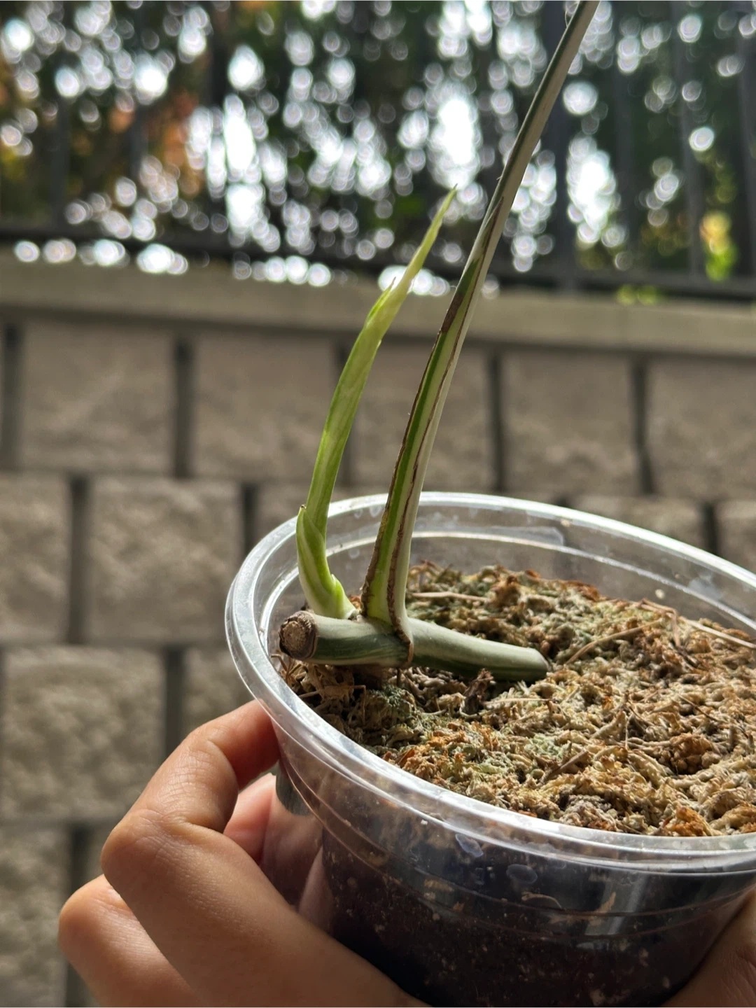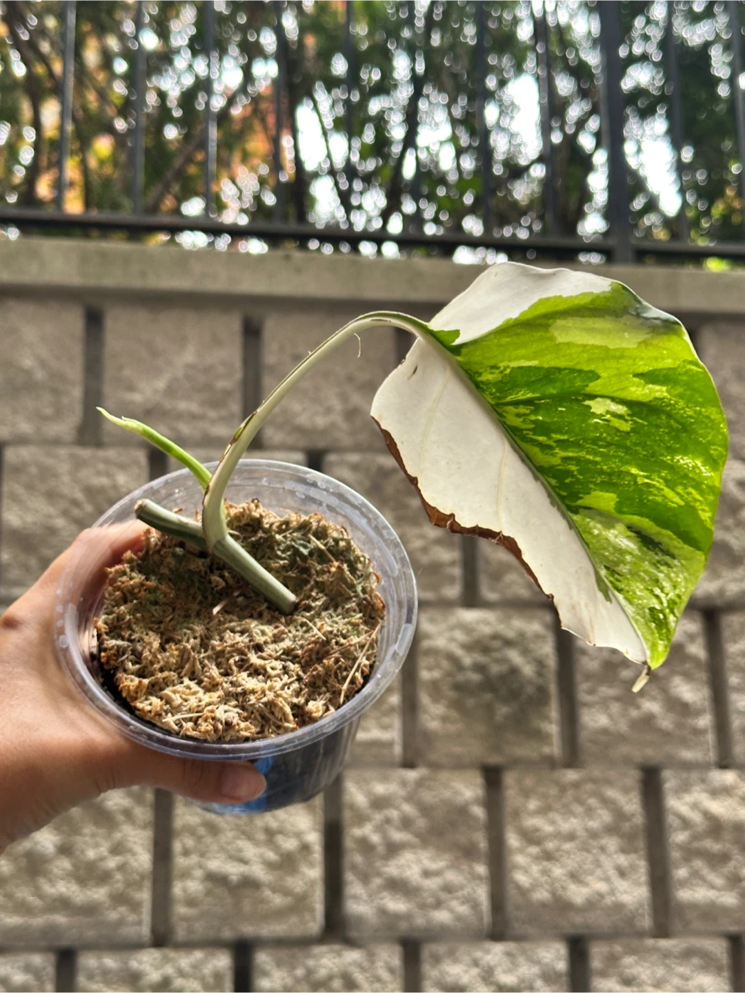 Fully rooted variegated mid cutting with high variegation on the leaf and stem. New leaf unfurling soon.