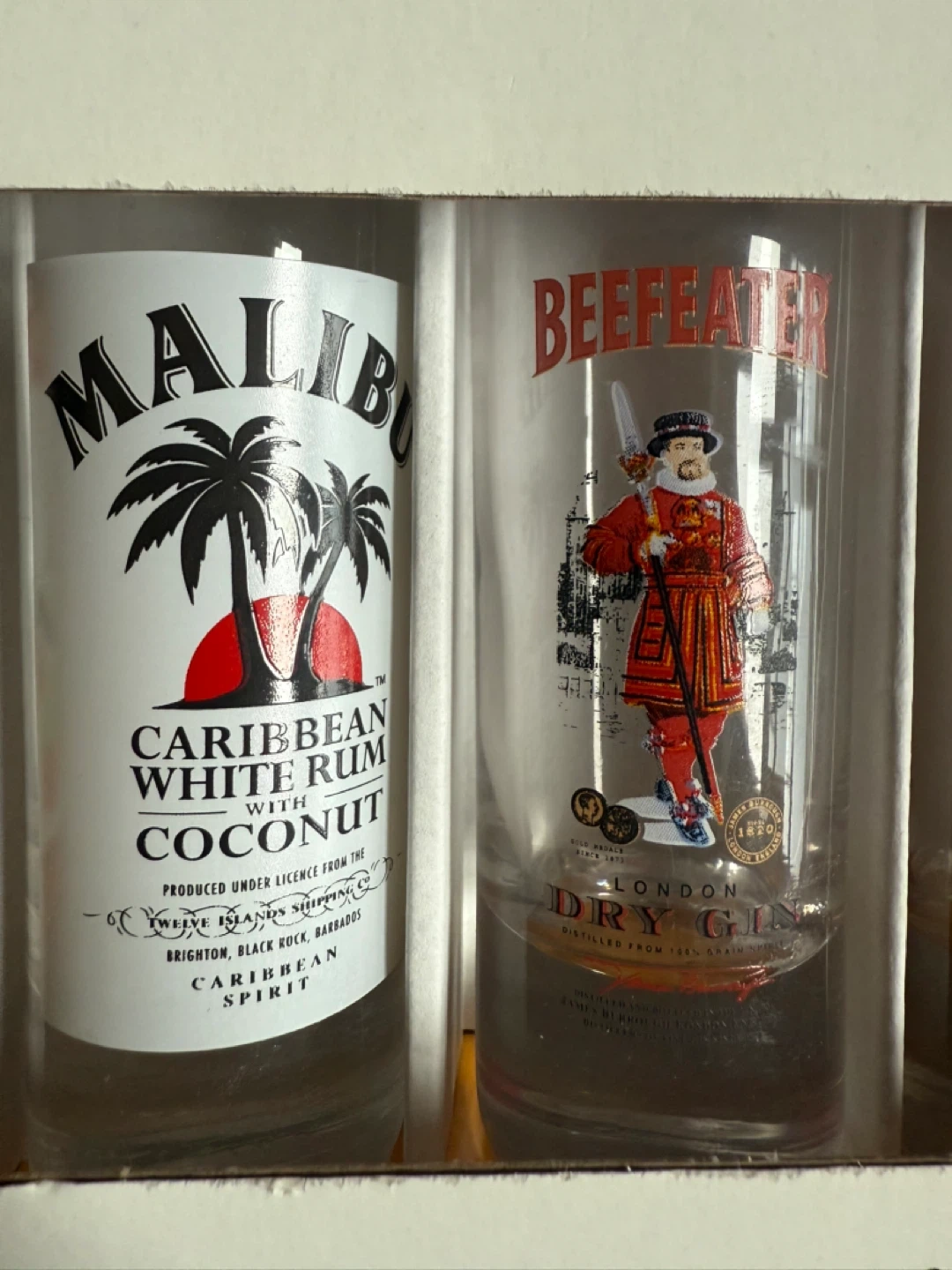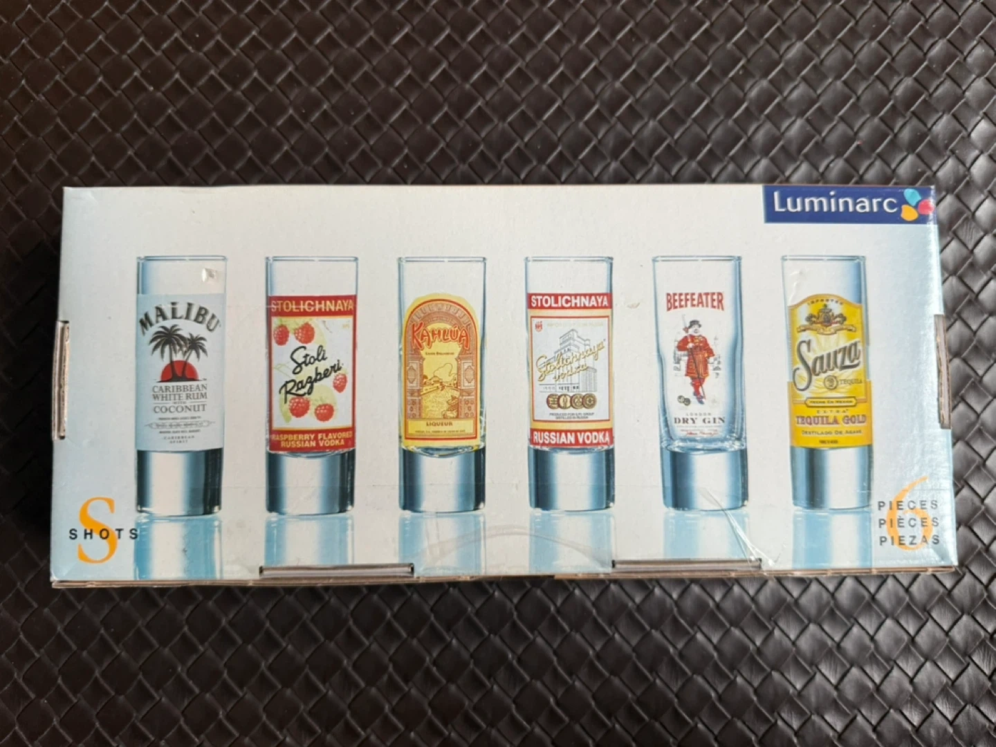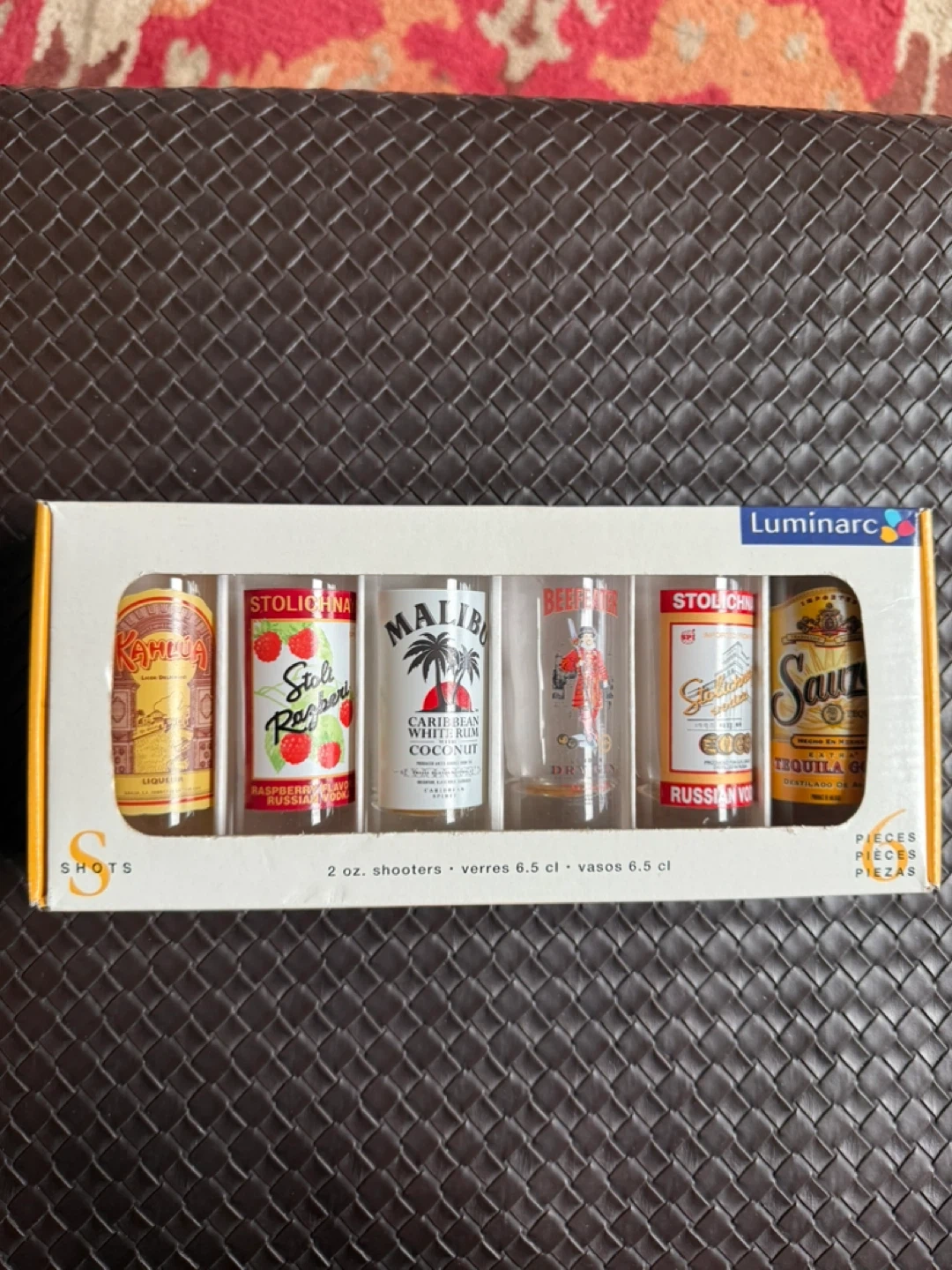 75Selling a brand new Luminarc shot glass set! This set includes six unique shot glasses each featuring a different liquor brand design: Malibu, Stolichnaya (Stoli Razberi), Kahlua, Beefeater, and Sauza. The glasses are 2 oz / 6.5 cl each, perfect for your home bar or as a gift. The set is still in its original packaging. Please see photos for size & condition. Cash and pick up only in W. Hillhurst NW. Thanks for looking!