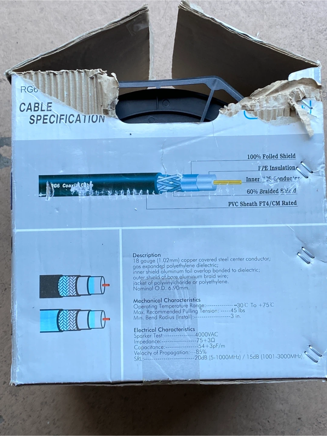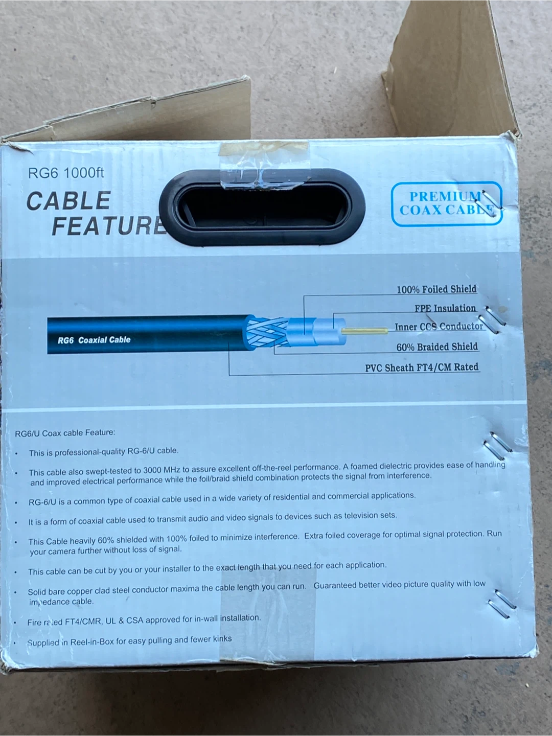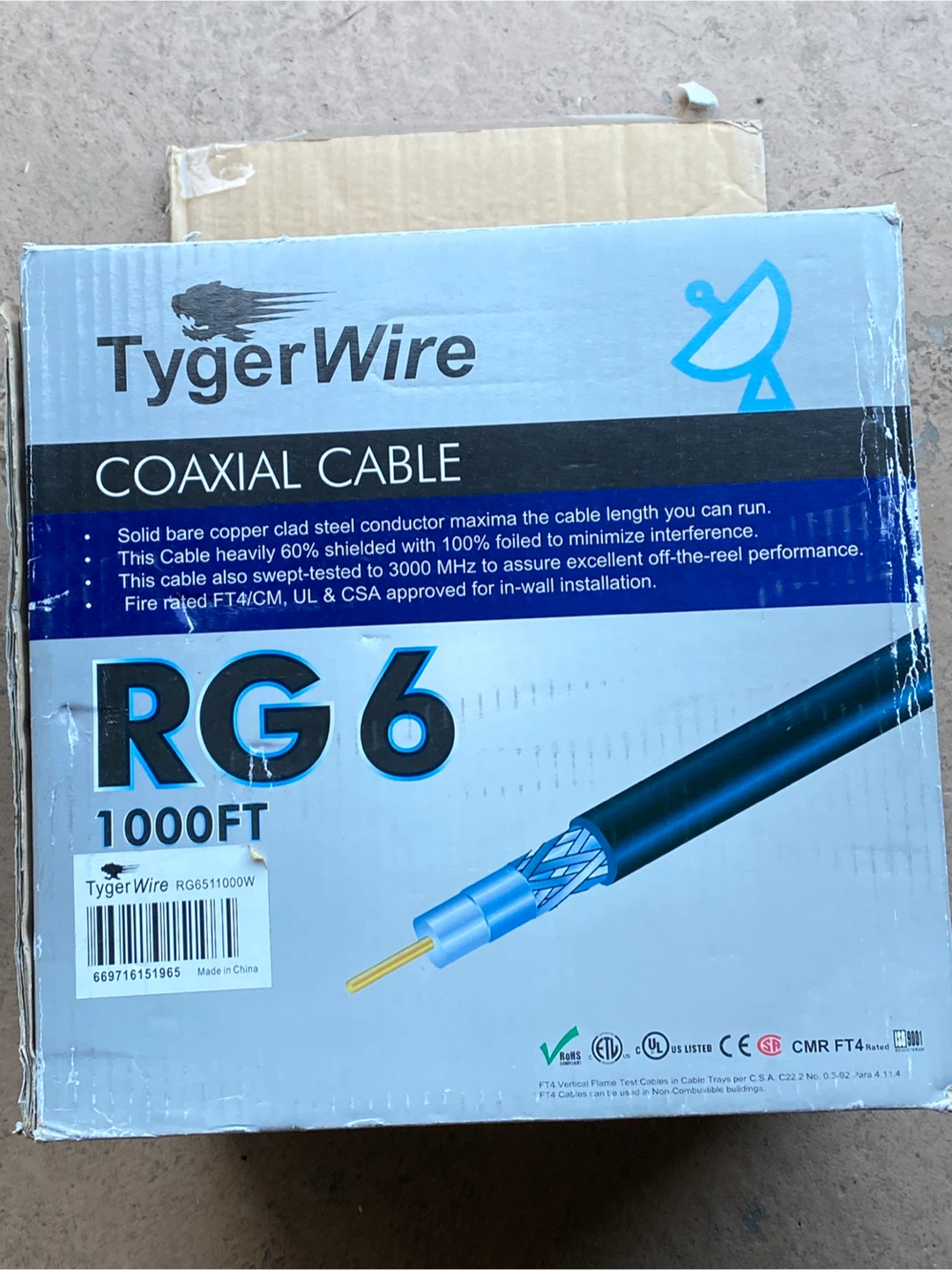 Selling a roll of TygerWire RG6 coaxial cable. It's a solid bare copper clad steel conductor that maximizes cable length. The cable is 60% shielded with 100% foiled to minimize interference and swept-tested to 3000 MHz for excellent off-the-reel performance. Fire rated FT4/CM, UL & CSA approved for in-wall installation