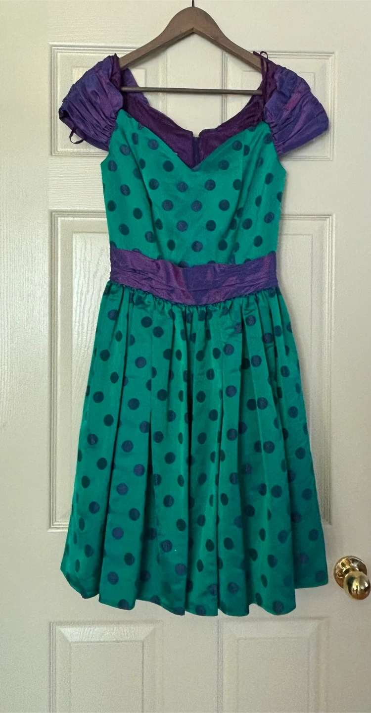 15Selling a cute green dress with purple polka dots! It has a purple sash and accents. Perfect for a party or special occasion.