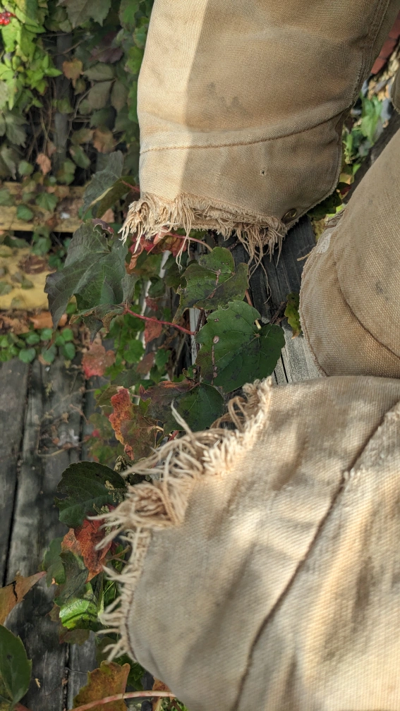 103Carhartt jacket in size XL Tall. It shows signs of wear, including fraying on the cuffs and some staining. Still lots of life left in this classic workwear piece!