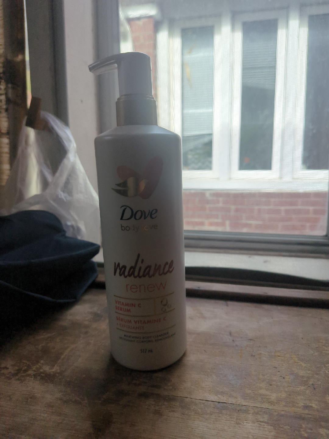 Selling a bottle of Dove body love radiance renew Vitamin C serum renewing body cleanser. It contains vitamin C and exfoliants. The bottle contains 517ml