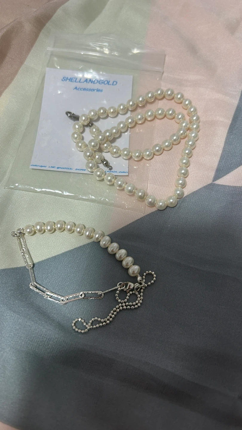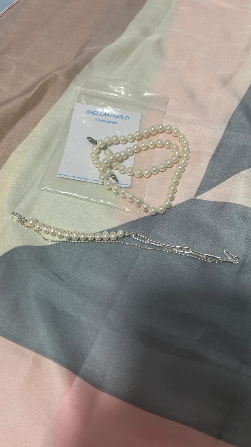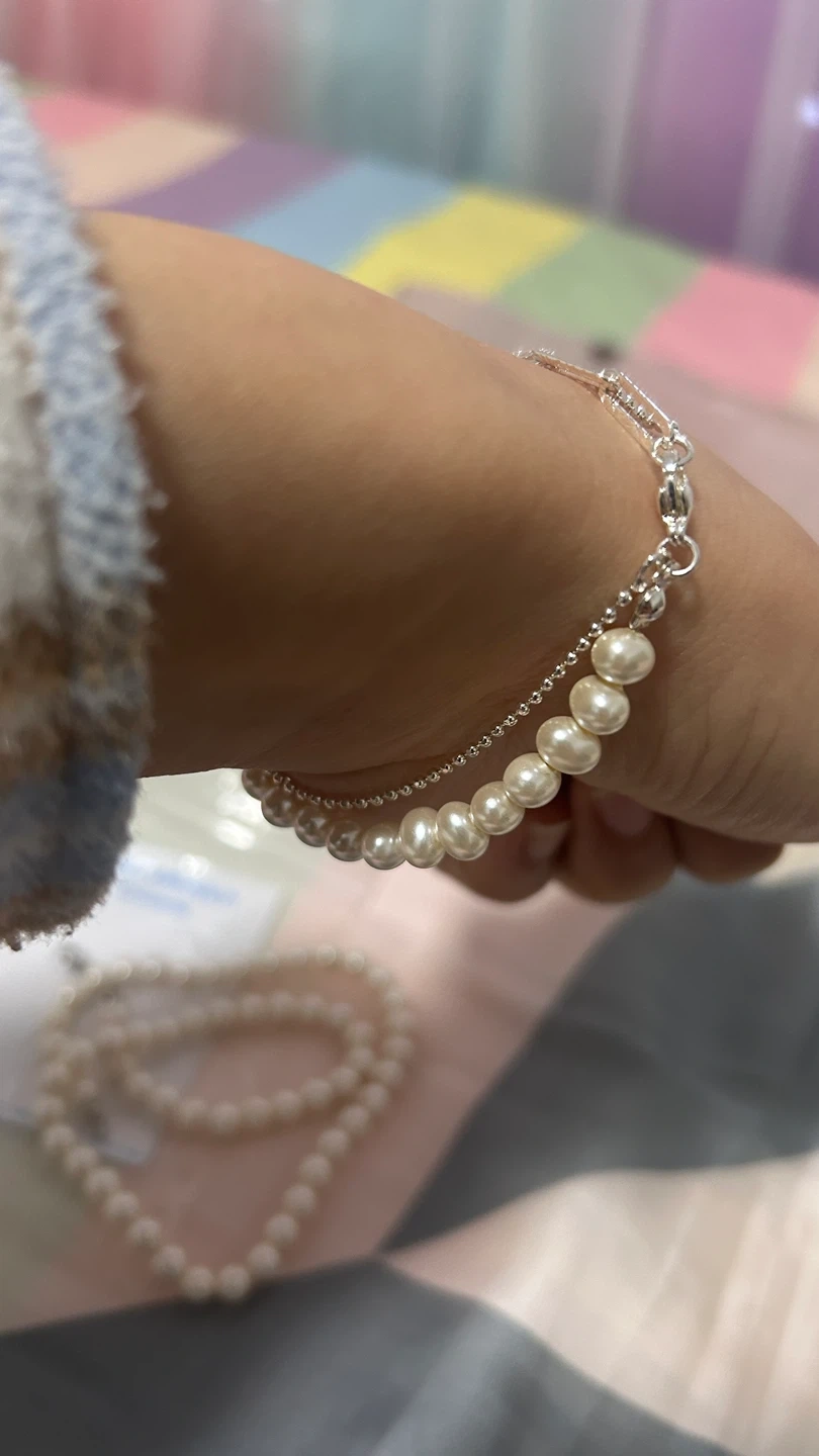 75Imitation pearls, very beautiful, necklace and bracelet set. This set includes a pearl necklace and a matching bracelet, perfect for adding a touch of elegance to any outfit. The pieces are in great condition and come with the original packaging.
