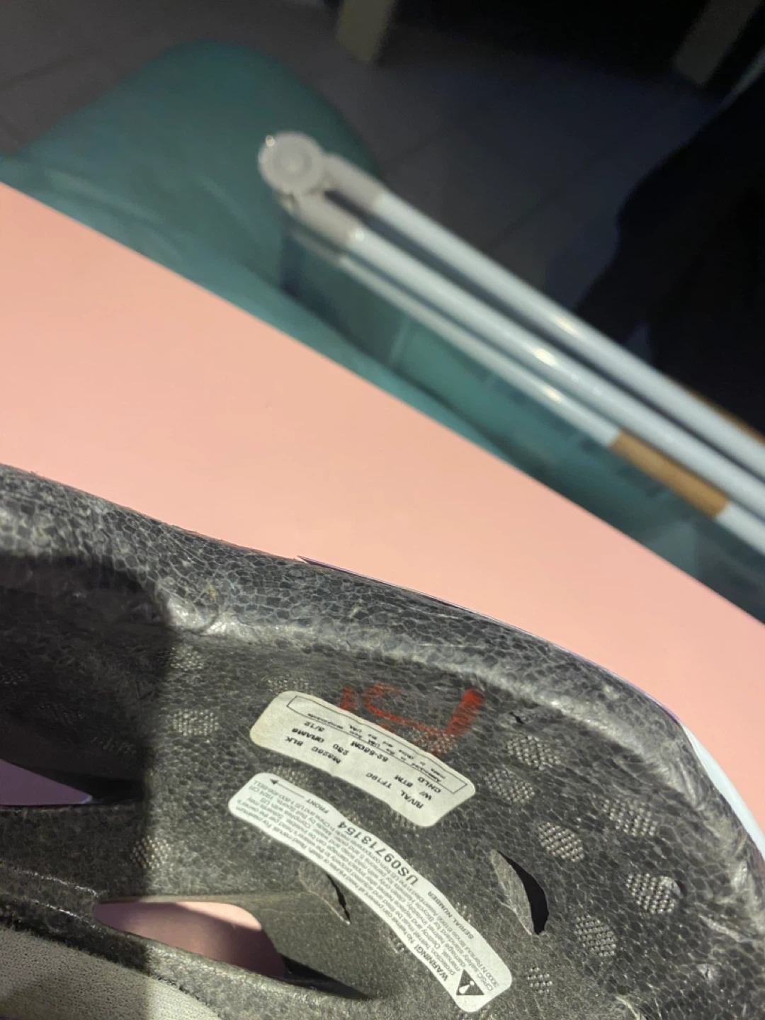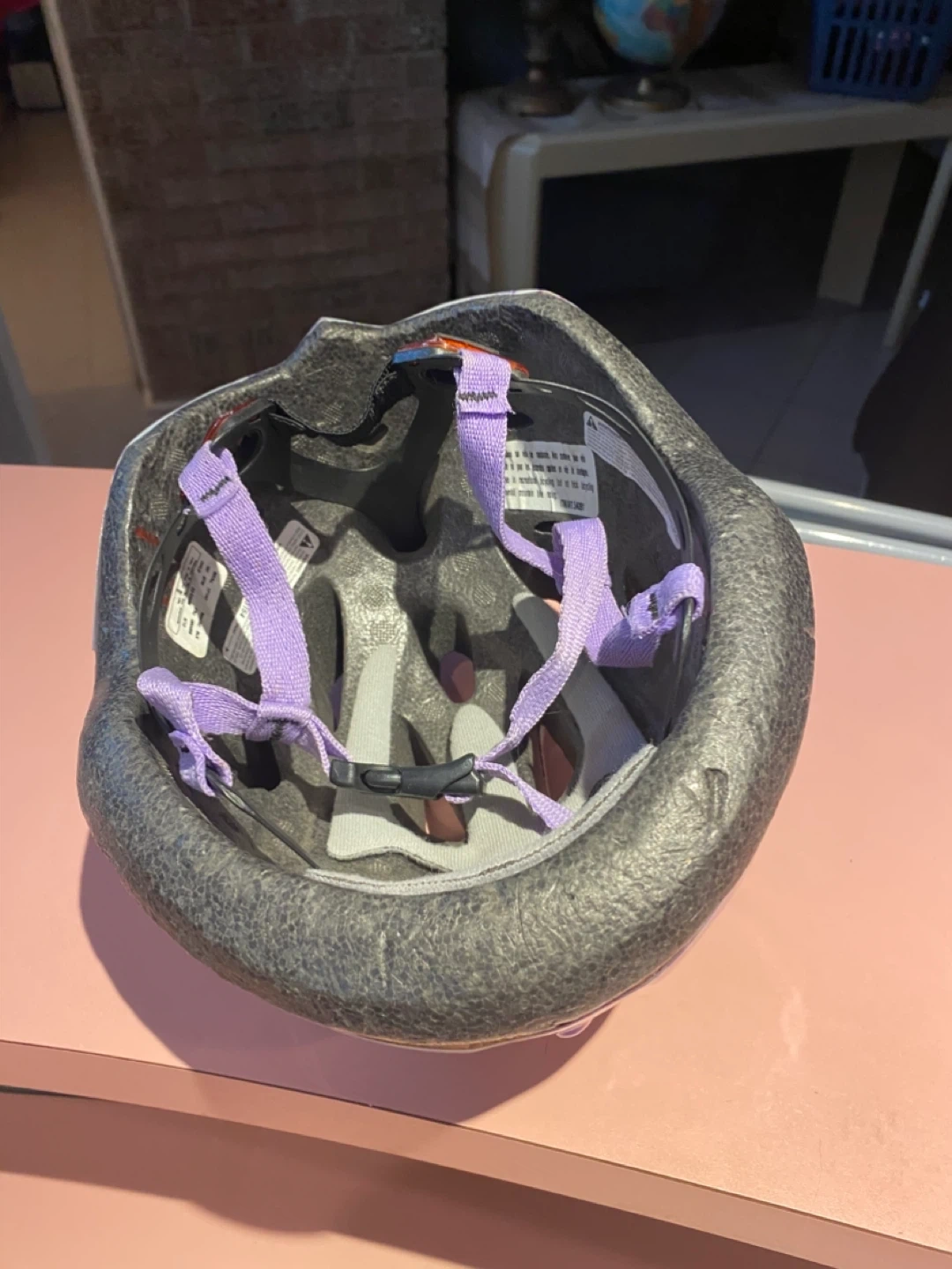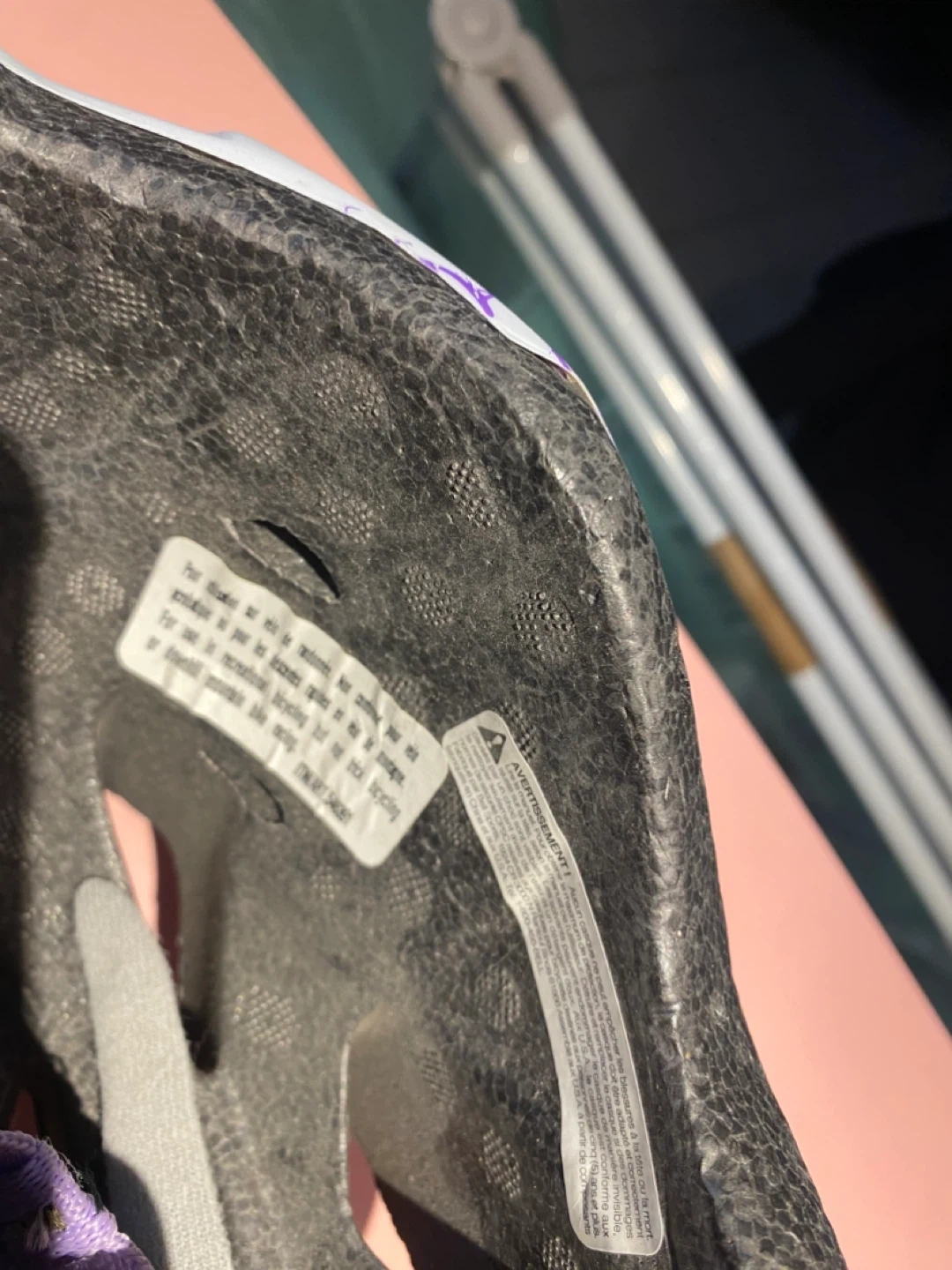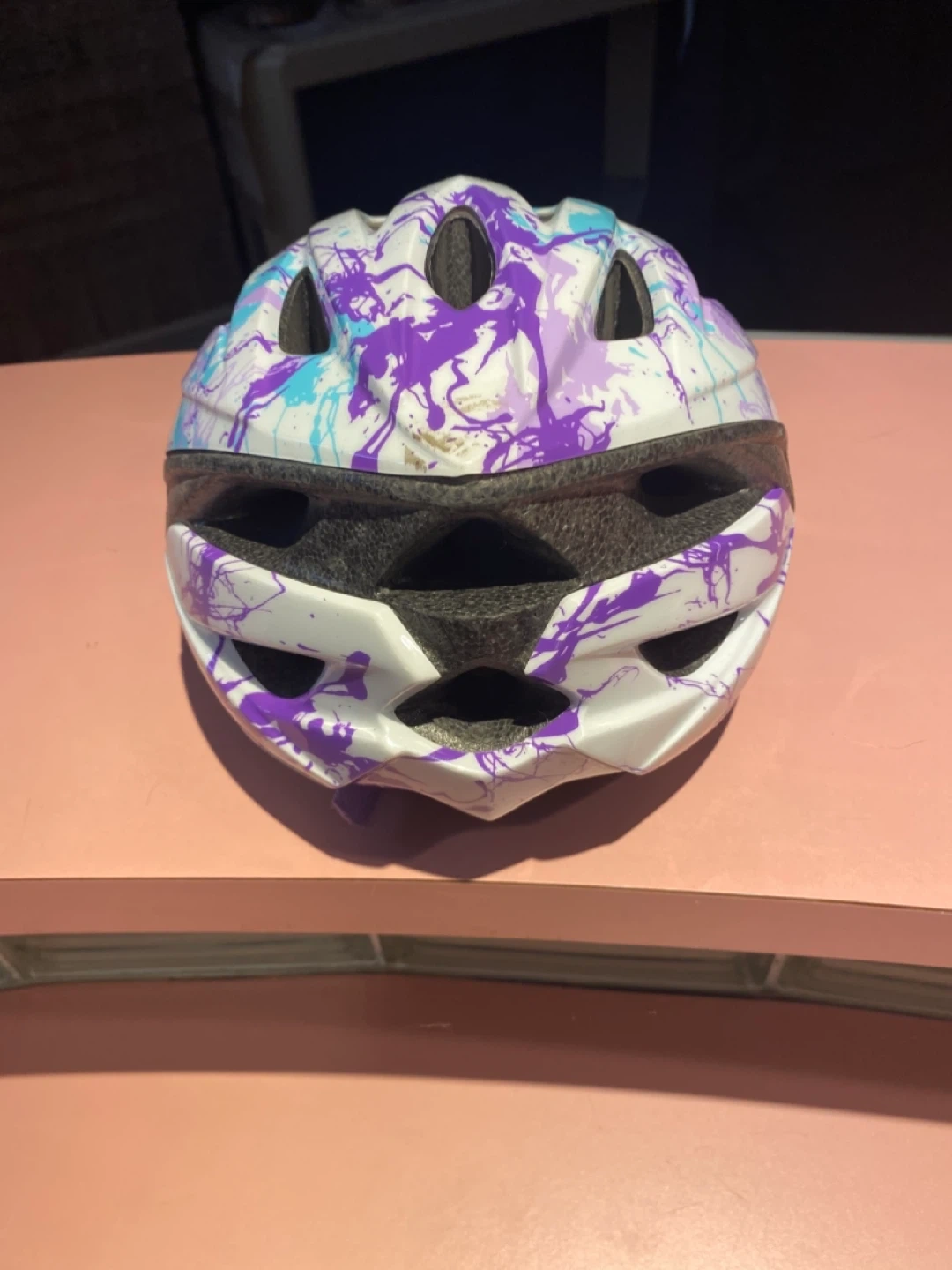 Selling a kids' bike helmet in a fun white, purple, and blue splatter paint design! It's in great condition and ready for a new owner. Perfect for keeping your little one safe while they ride their bike or scooter