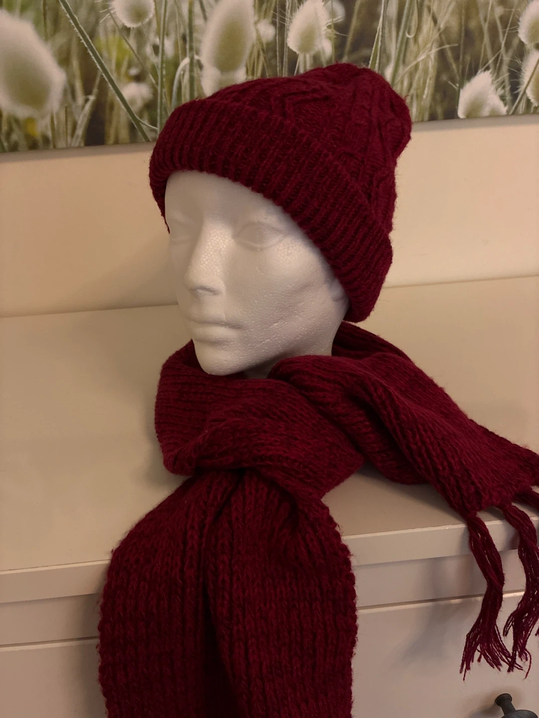 Cozy up with this handmade knit hat and scarf set! The rich burgundy colour is perfect for adding a touch of warmth to any outfit. The hat and scarf are both in great condition and ready for a new home! Perfect for those chilly Canadian days