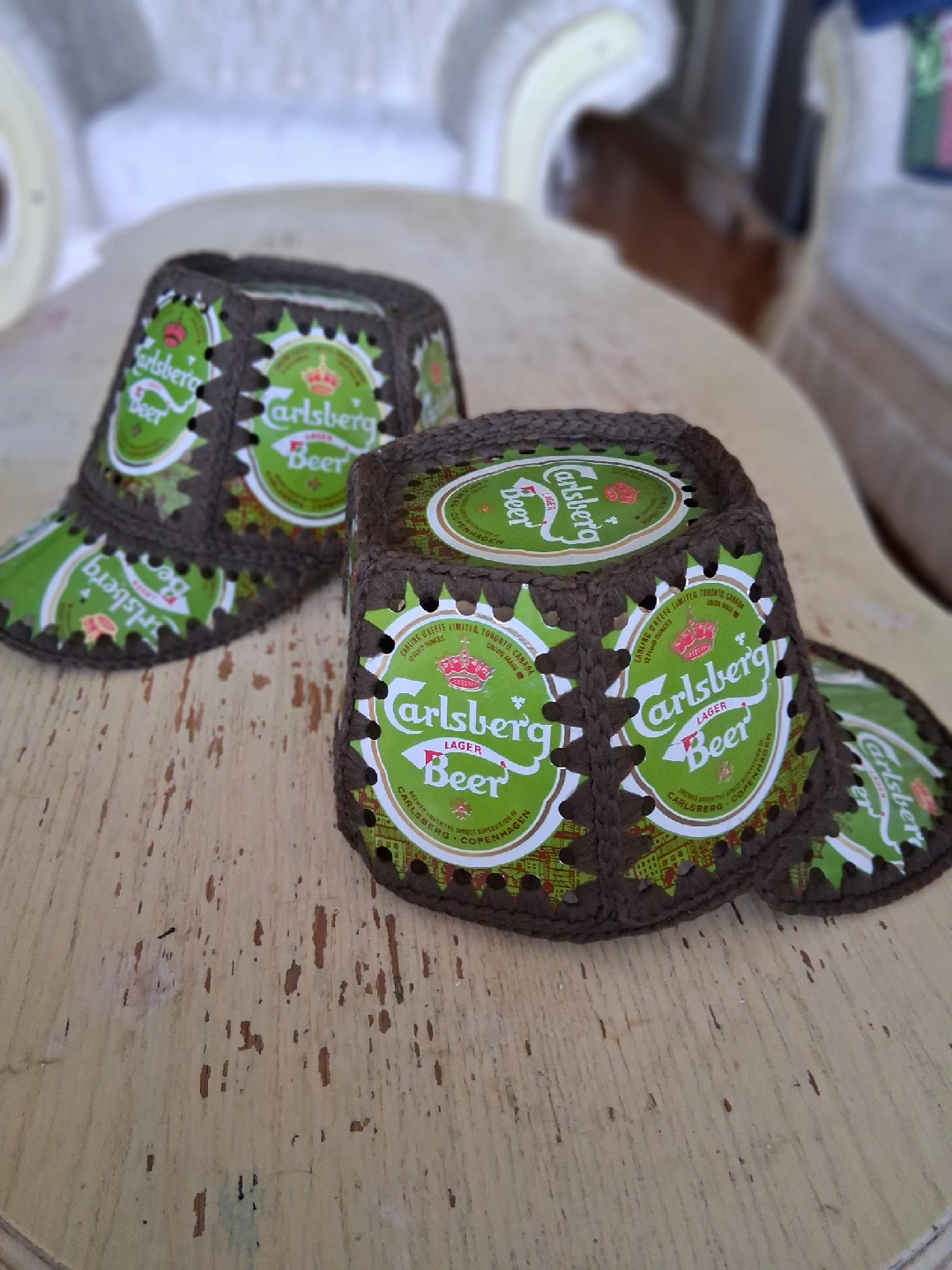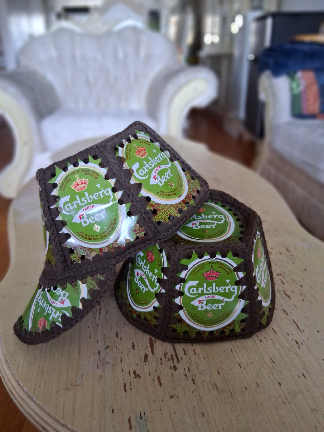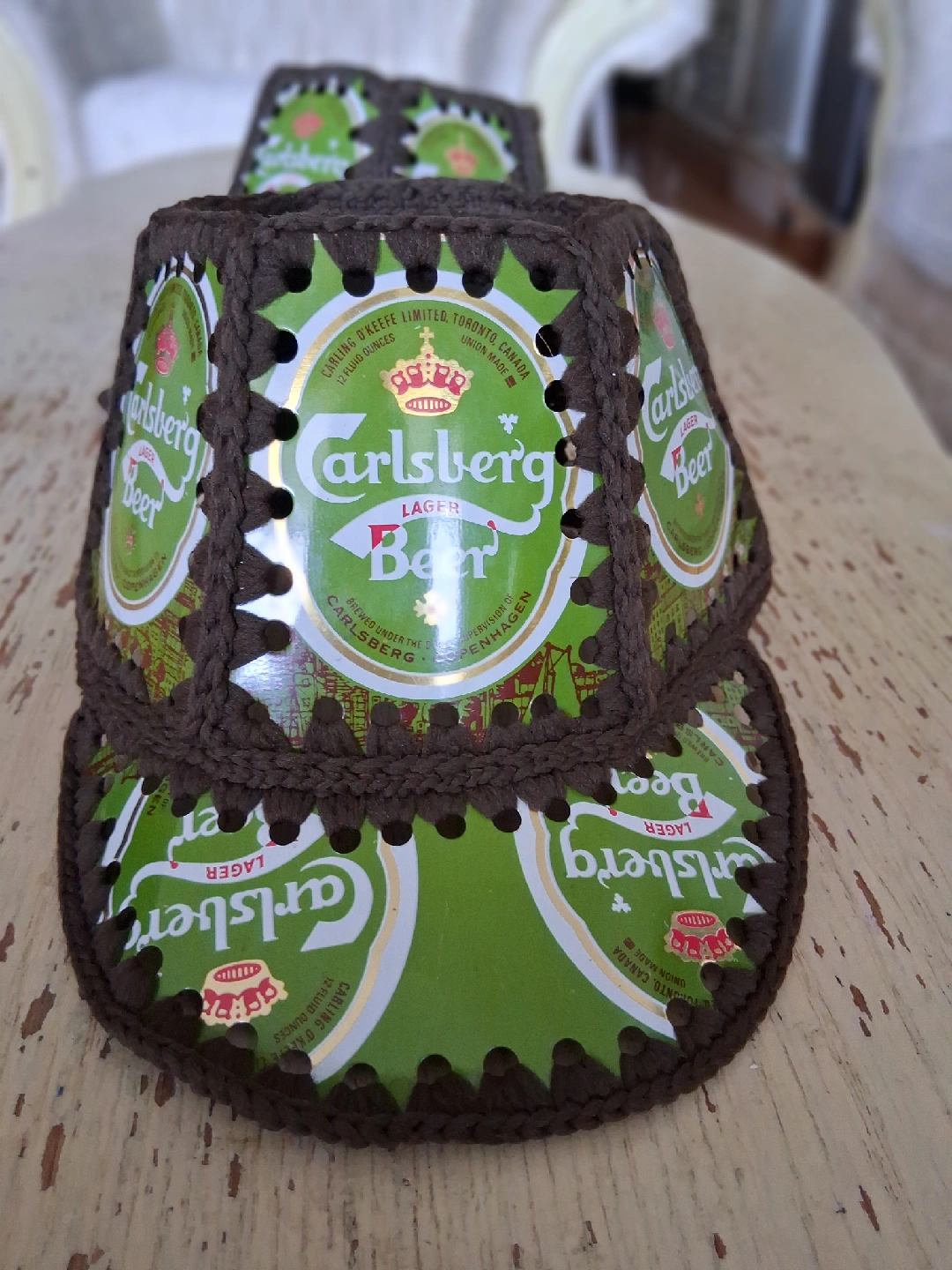 Unique and handcrafted Carlsberg beer can hat! Made from recycled beer cans and makramade with brown yarn. Perfect for a fun accessory or a quirky gift for a beer lover. Oktoberfest!!!!