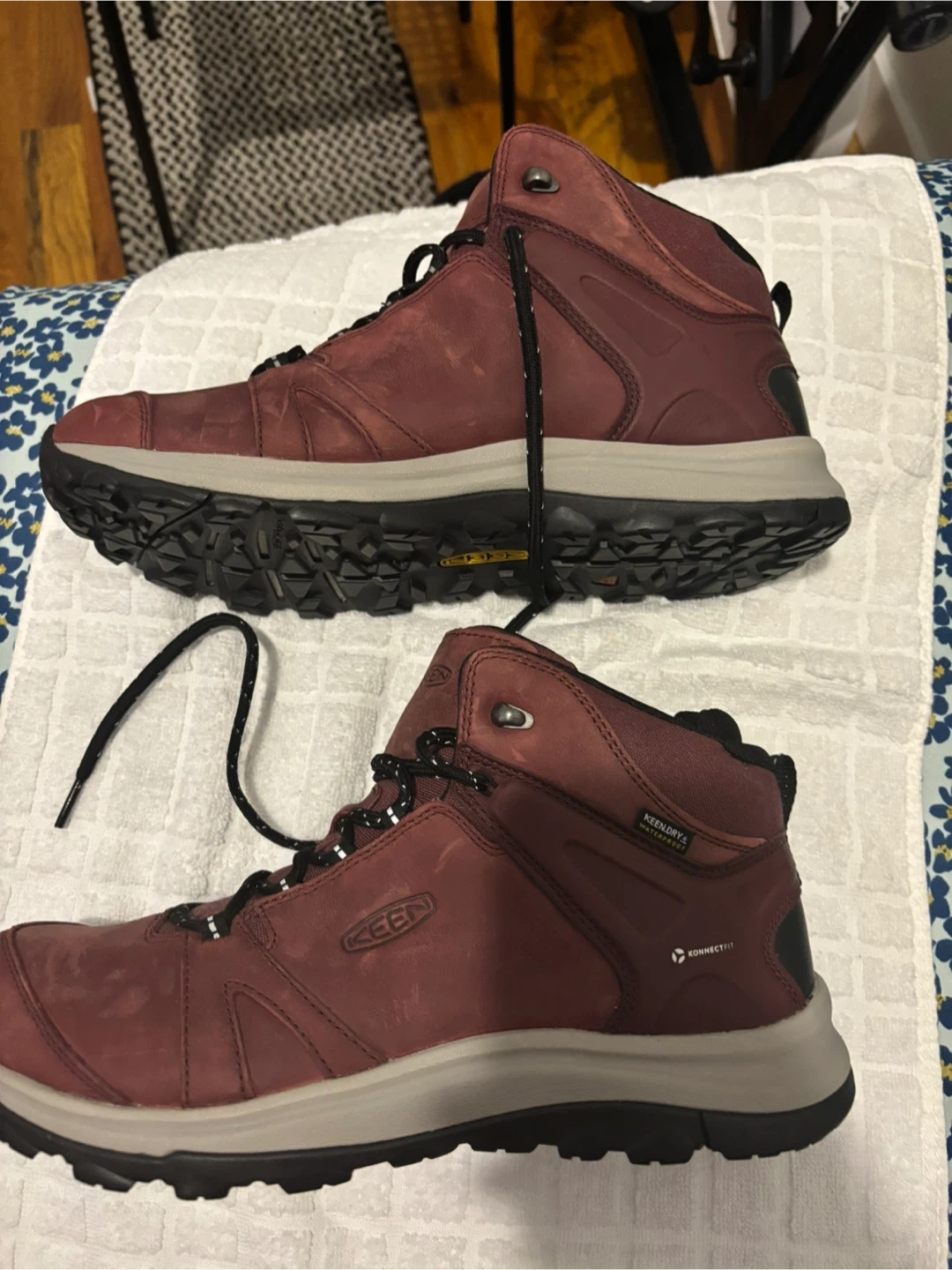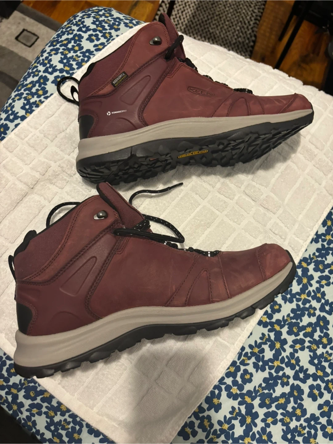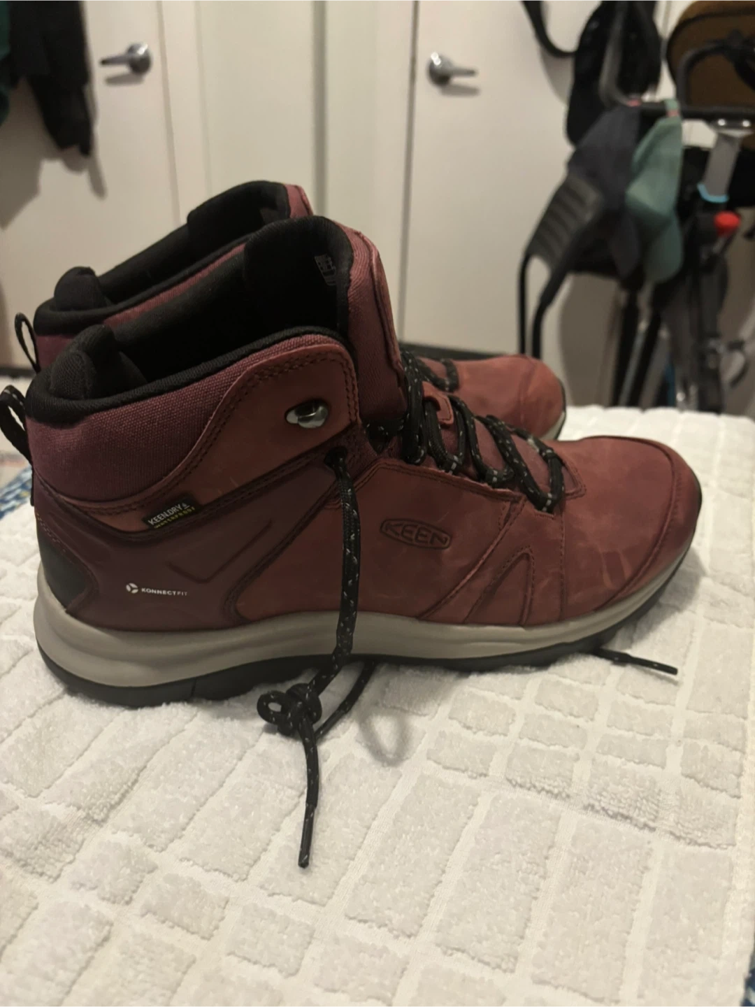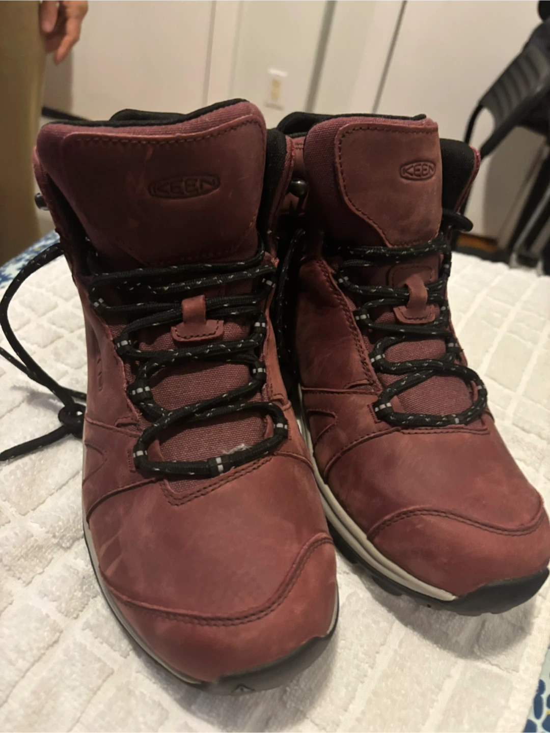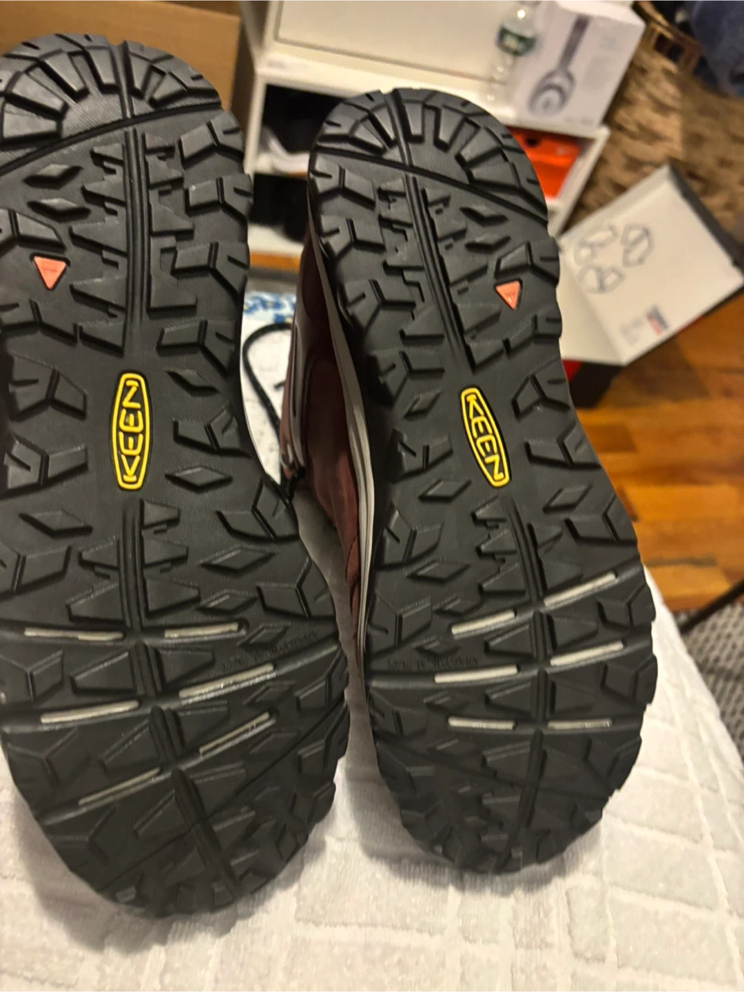 New! These KEEN hiking boots are ready for your next adventure! They are a stylish burgundy color and appear to be in good condition. Perfect for hitting the trails or just everyday wear. Size 11. Color: burgundy