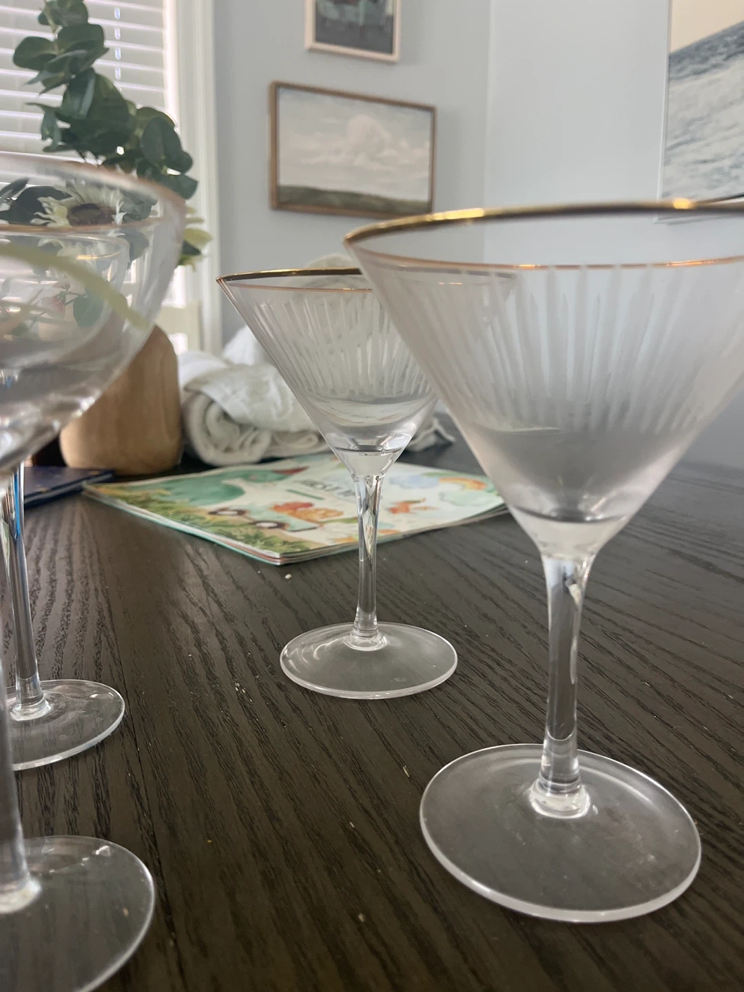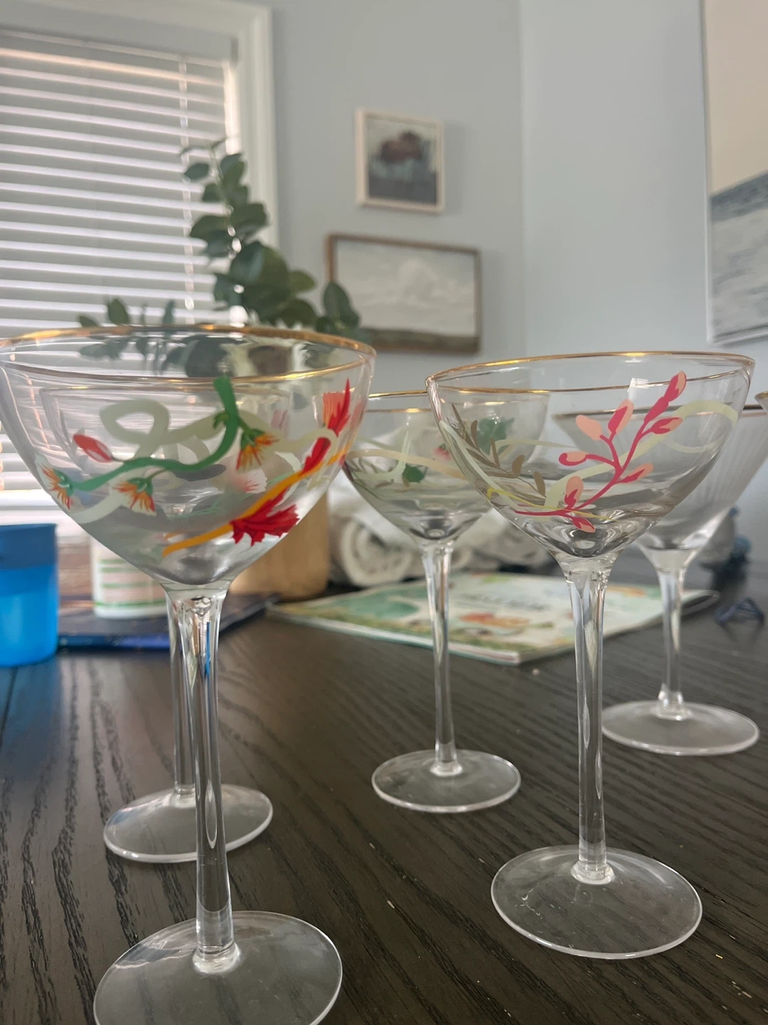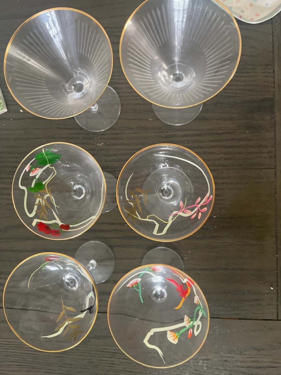 Selling a set of 6 martini glasses. They have a gold rim and some have a floral design. Perfect for your next cocktail party!