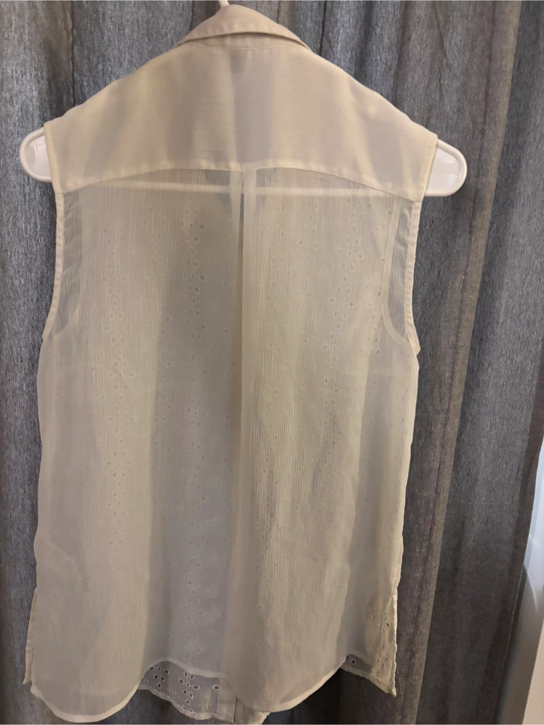 Here's a cute white sleeveless blouse from forever21! It has a collared neckline and a button-down front. The material is lightweight and breathable, perfect for warmer weather