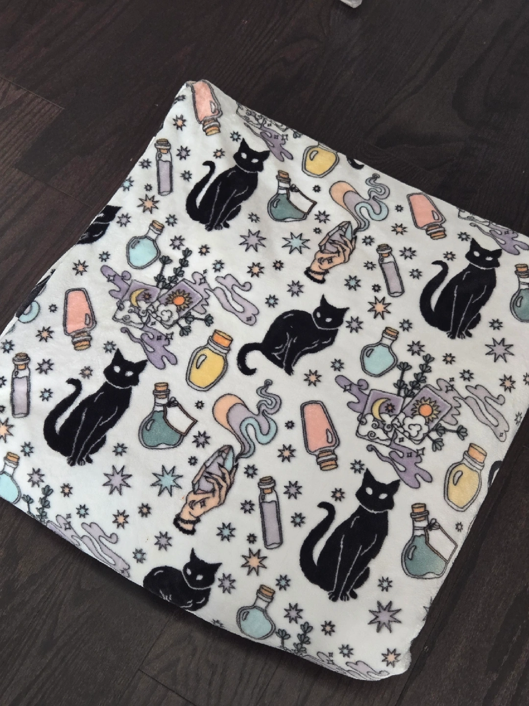 677Selling a cozy blanket with a cute cat and potion print! It's perfect for adding a touch of whimsy to your home decor. The blanket features black cats, potion bottles, stars, and magical elements on a white background. It's in great condition and ready to keep you warm and snuggly!