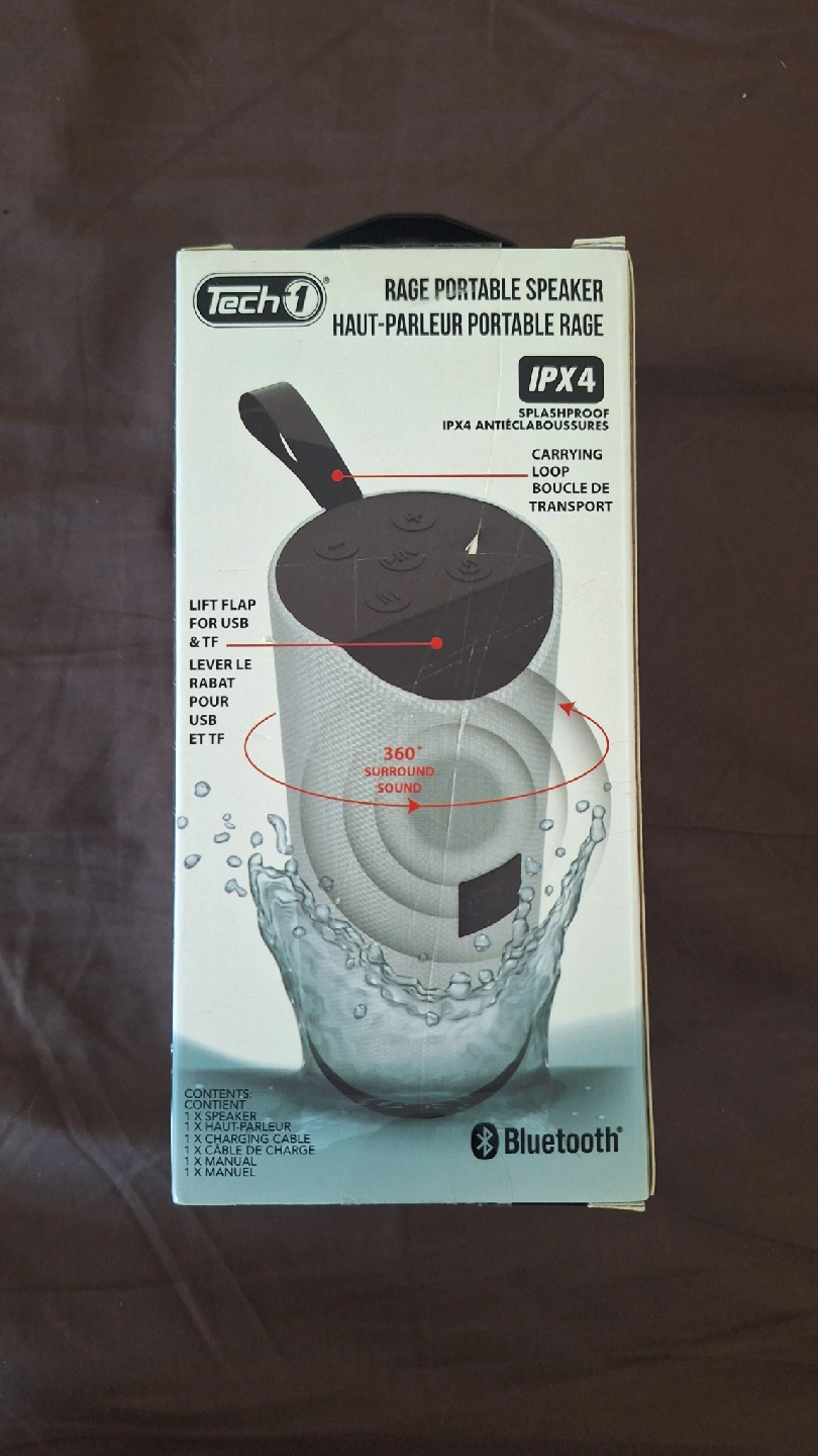 276Selling a brand new Tech1 Rage portable speaker, still in its original packaging! It's splashproof (IPX4) and has 360° surround sound. The box includes the speaker, a charging cable, and the manual. Perfect for taking your tunes on the go