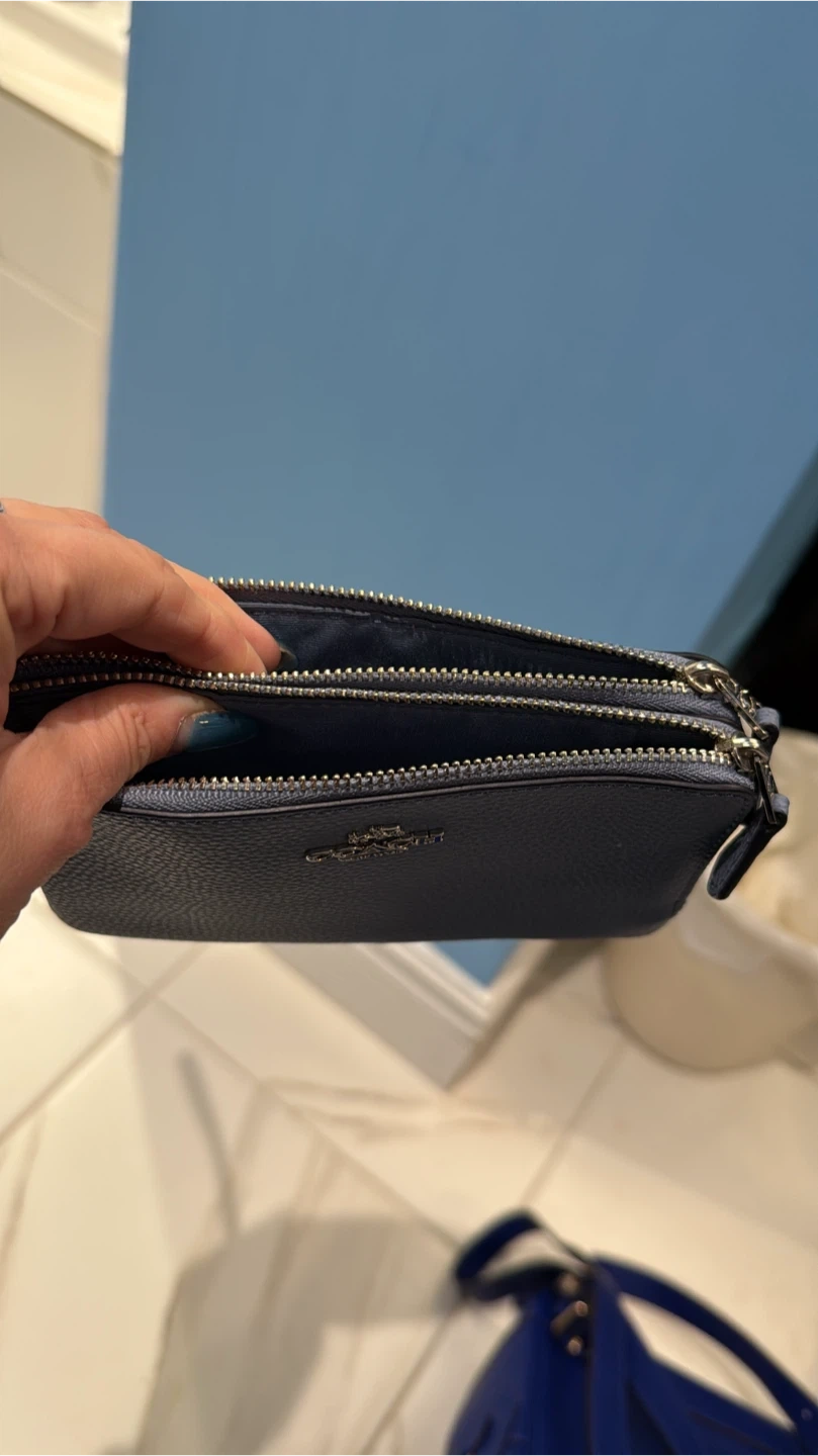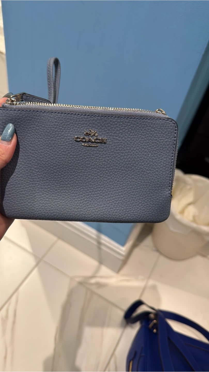 65Selling a Coach double zip wristlet in a lovely blue colour! It's perfect for keeping your essentials organized while on the go. This wristlet features two zippered compartments, providing ample space for your cards, cash, and phone. The textured leather adds a touch of sophistication to this practical accessory. In excellent condition only used a couple times.