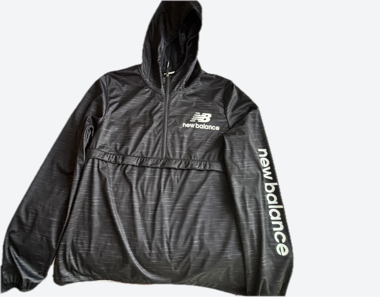 This is a New Balance hooded jacket in black. The jacket features the New Balance logo on the front and down the sleeve. It's perfect for layering or wearing on its own for a light workout or run!