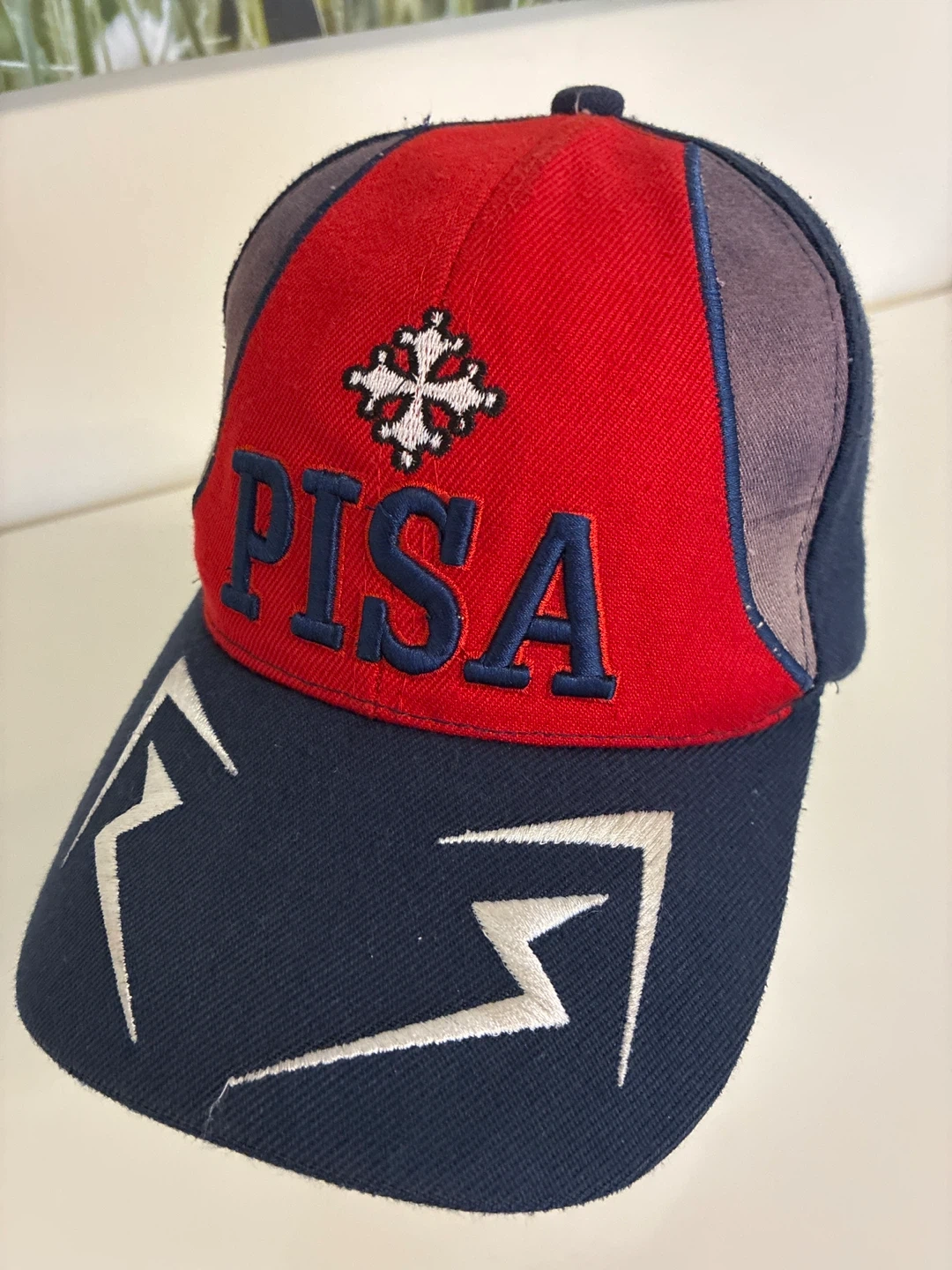 Selling a PISA baseball cap! It features a red crown with the word "PISA" embroidered on the front, and a navy blue brim with a white design. A stylish and comfortable accessory for any casual outfit