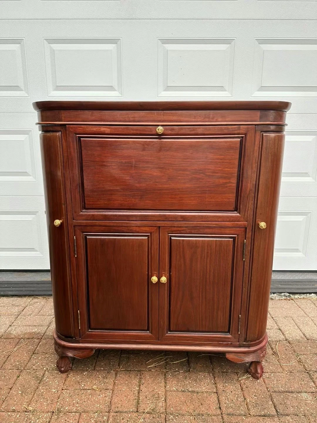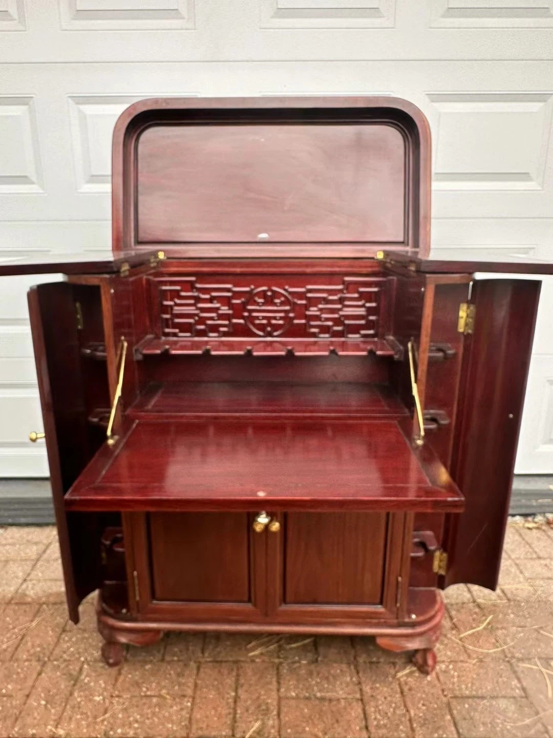 10Beautiful antique mahogany bar cabinet in great condition. This unique piece features intricate detailing and a rich, warm finish. Perfect for storing your favourite spirits and glassware, it will add a touch of elegance to any room. A real statement piece!