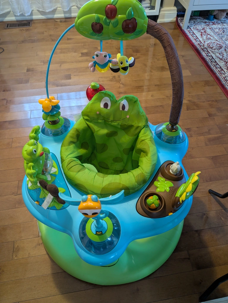 This Evenflo ExerSaucer Jump & Learn is in great condition and features a fun frog theme! It's designed to help your little one develop their motor skills while having a blast. The ExerSaucer has various interactive toys and activities to keep your baby entertained and engaged. Perfect for babies who are ready to jump and play!