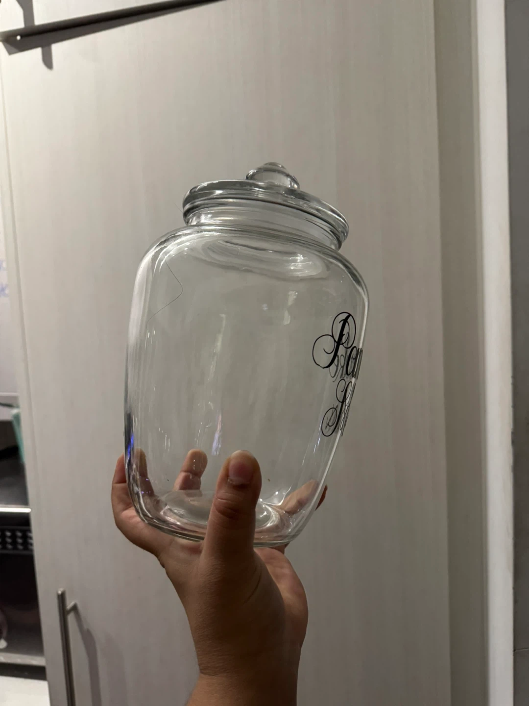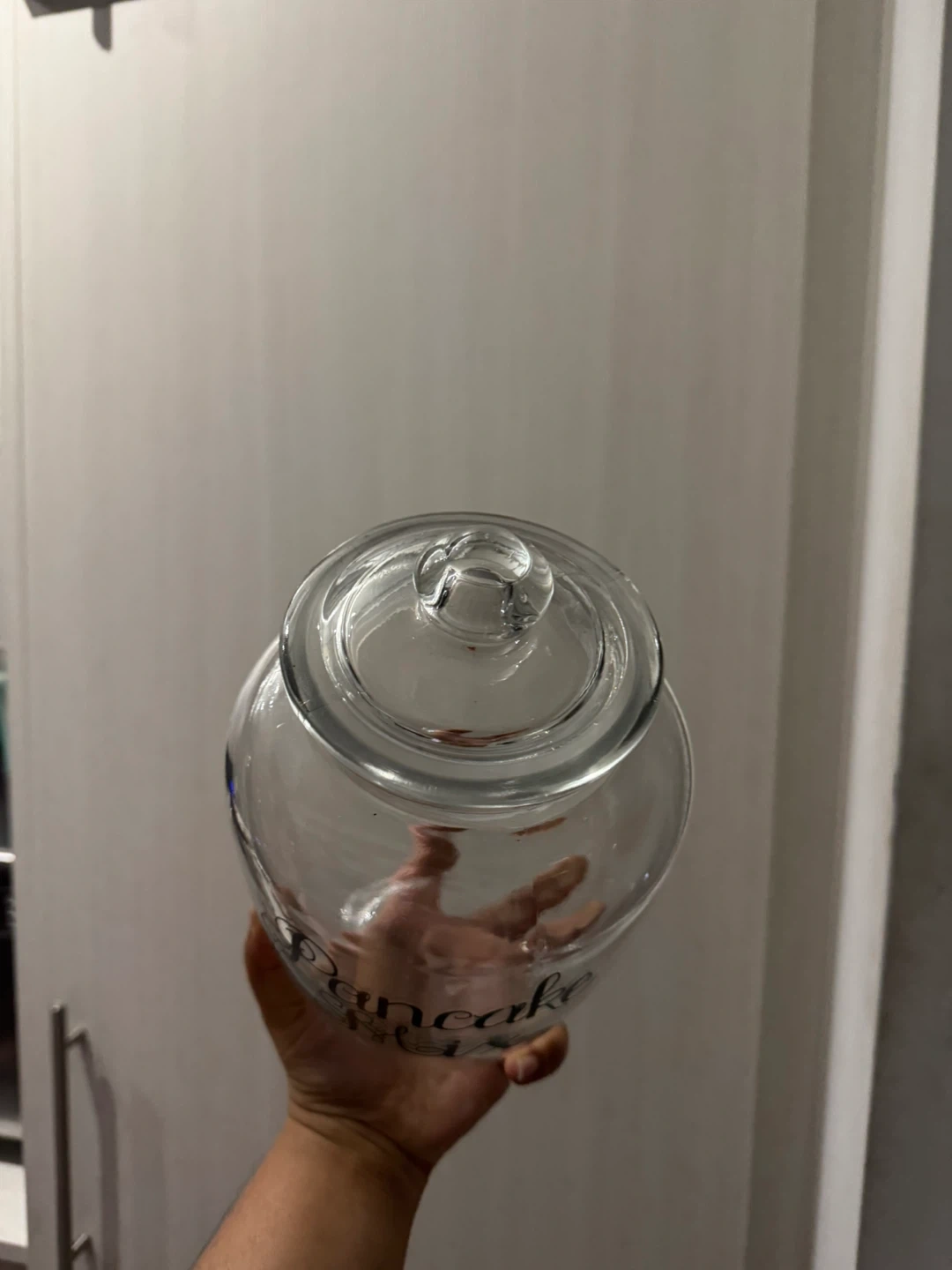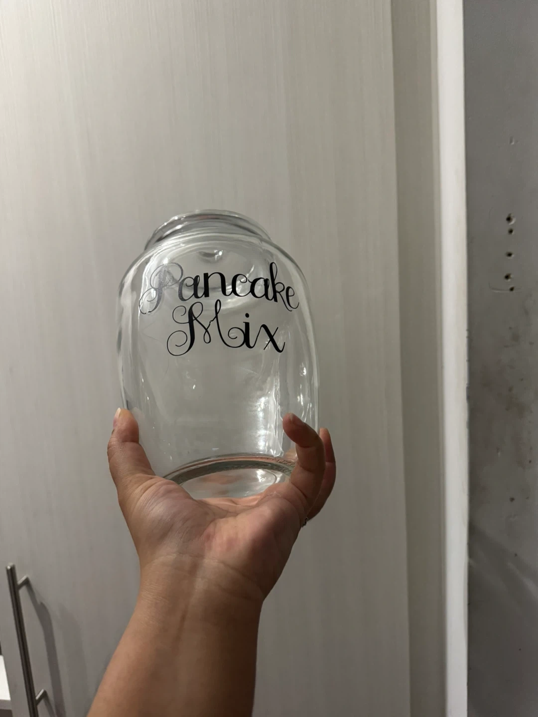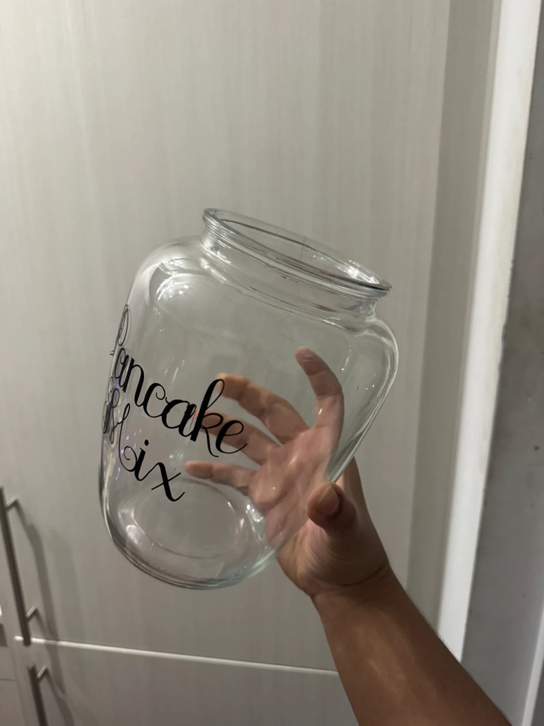 Selling a clear glass jar with a lid that says 'Pancake Mix' on it. It’s in great shape and perfect for storing your pancake mix or other dry goods in a stylish way!