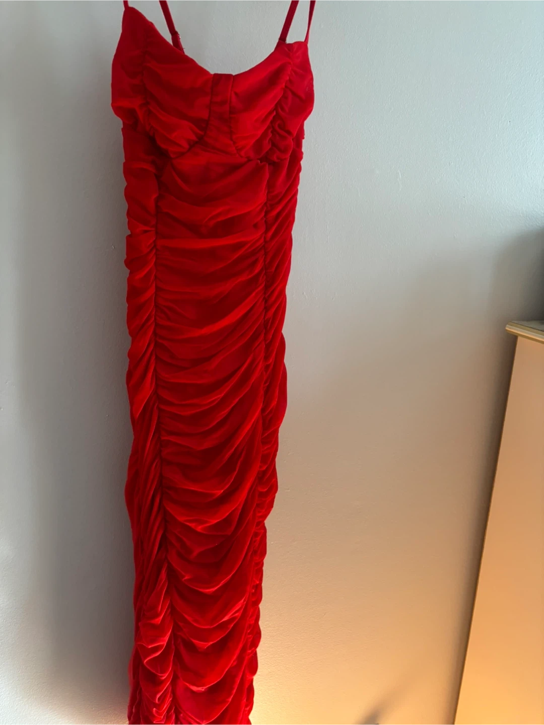 17Selling a vibrant red ruched bodycon dress! It's in great condition and ready for a new home. The ruching detail gives it a flattering silhouette. Perfect for a night out or special occasion Not used , 1time try Available more dresses 1time used or never used due to size error