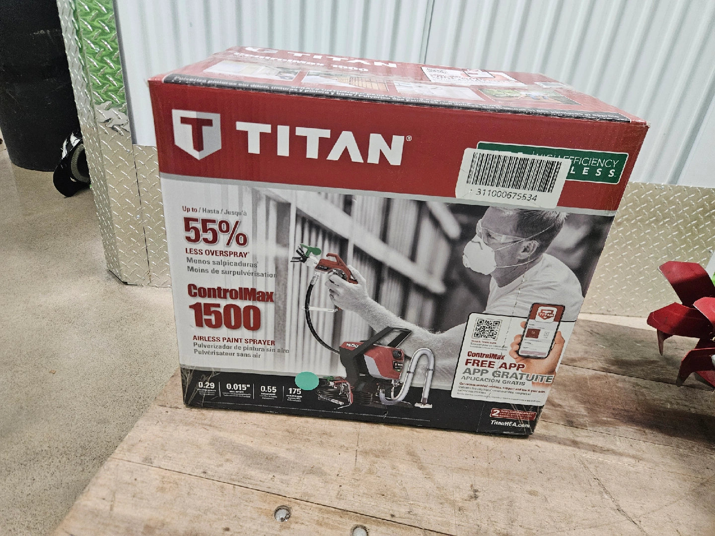 Selling Titan ControlMax 1500 airless paint sprayer, still in the box! This sprayer offers up to 55% less overspray. It's a ControlMax 1500 model. used to paint my condo. have no use for it now. open to offers
