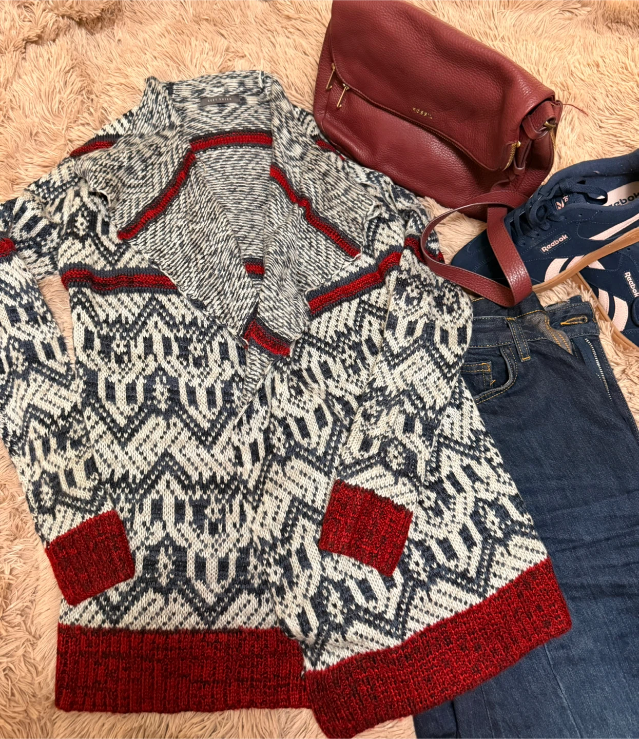Cozy Talbots cardigan sweater in a size xs, runs a bit bigger. It features a unique pattern with navy, white, and red / burgundy accents. Perfect for layering on cooler days.