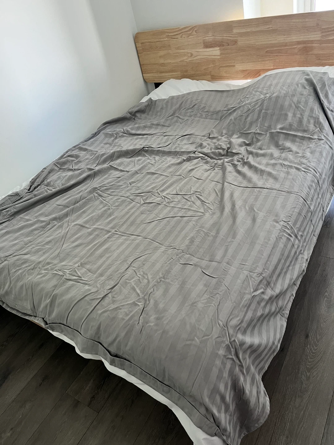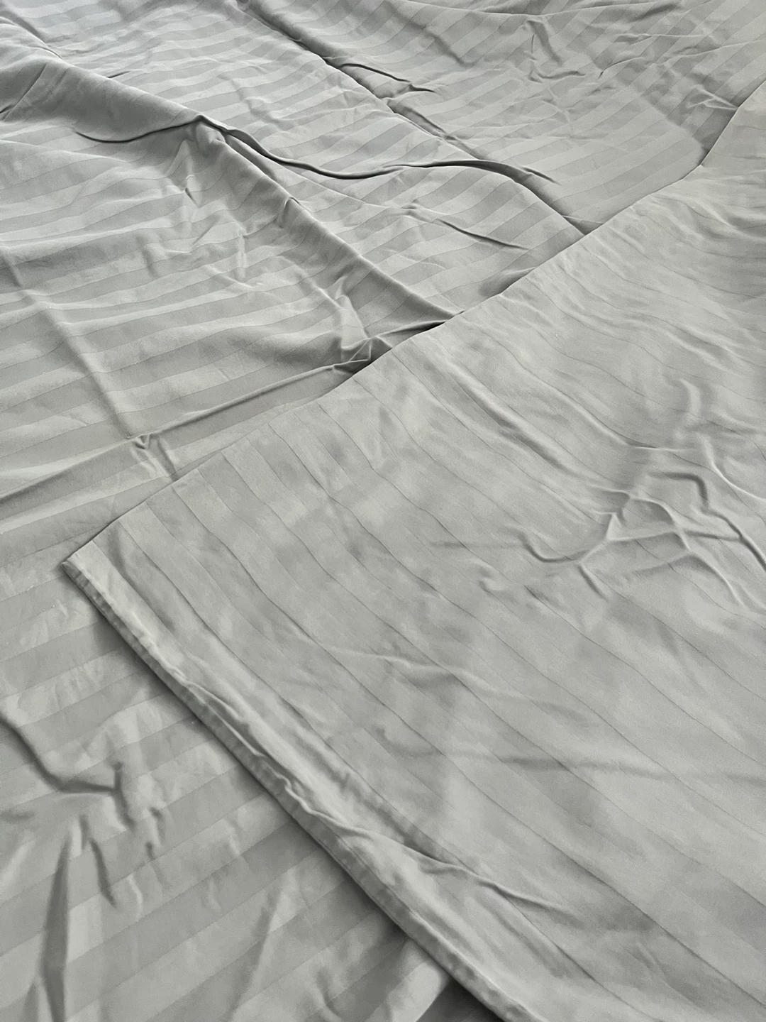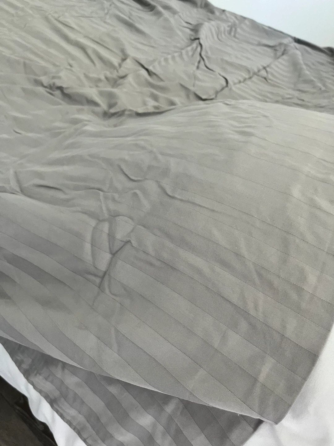 Selling a grey striped bed sheet set. It's in great condition and would look lovely in any bedroom! The material feels soft and comfortable, perfect for a good night's sleep