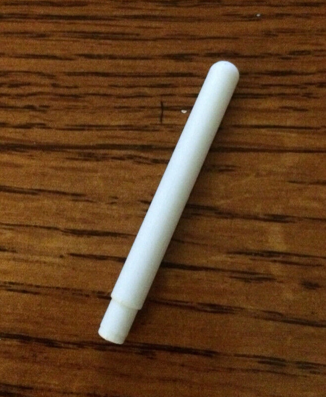 Reversible Singer sewing machine spool pin. New. Plastic. Replacement pin to hold spool of thread on top of vintage sewing machine. #172007 Rounded end fits machines Stylist 327, 327K, 328, 329, 337, 338, 347, 348, 401, 403, 404, 413K, 413K13, 416K, 418, 457, 466, 476, 477, 478, 502, 507, 509, 513, 514, 518, 522, 527, 533, 534, 538, 6513, 6548. #173571 Indented end fits machines 1247, 1263, 1802, 1803, 1812, 1852, 1853, 1862, 1872, 1873, 2302, 2303, 2304, 2313, 2330, 237, 239, 240, 242, 2430, 247, 247AP, 250, 2503, 2504, 2515, 252, 2530, 257, 258, 259, 285, 288, 290, 3101, 3102, 3103, 3105, 3314, 3317, 3343, 360, 362, 366, 367, 417, 476 Stylist, 476K Stylist, 6100, 6102, 6104, 6105, 6106, 6110, 6120, 6130, 6136, 6146, 6152, 6156, 6174, 6184, 7100, 8700. $8. Near the Burlington/Oakville border.