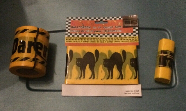 15Halloween decorations caution tape for sale. Most new. 20-foot black cats ribbon new in original package, thick roll of “Enter if you dare” ribbon never used, and partially-used roll of “Halloween Zone” ribbon. All three for $8. Near the Burlington/Oakville border.