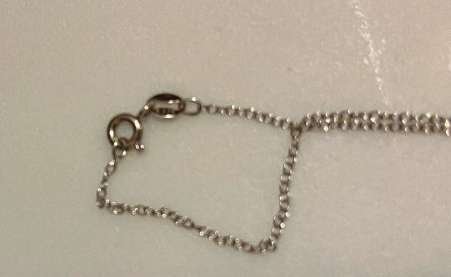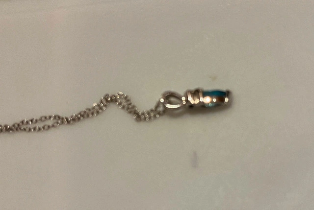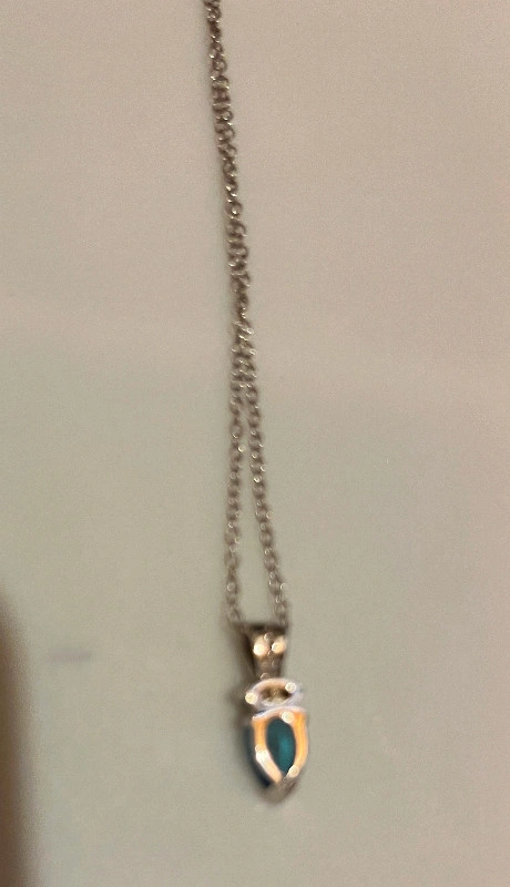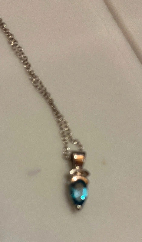 Blue gemstone necklace for sale. Might be aquamarine (not glass anyway). Silver or possibly white gold. Gem is teardrop-shaped with a sort of crown. Stone about 8mm tall, pendant about 17mm tall total, and chain about 45cm long. Maybe worn a couple times. $80. Near the Burlington/Oakville border.