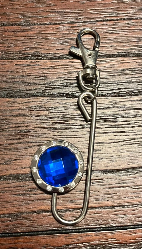 15Purse key hook for sale. Hangs in your purse so you can find your keys. Blue gemstone on silver-colored metal. About 10 cm long with gemstone about 2.5 cm wide. Never used. $8. Near the Burlington/Oakville border.