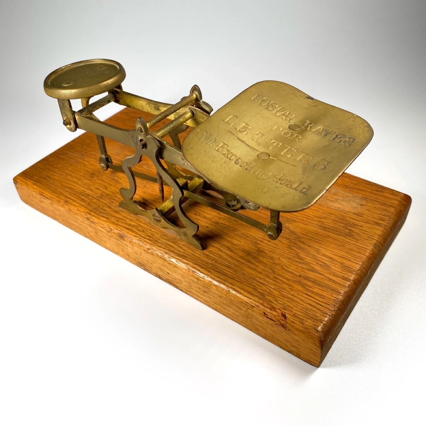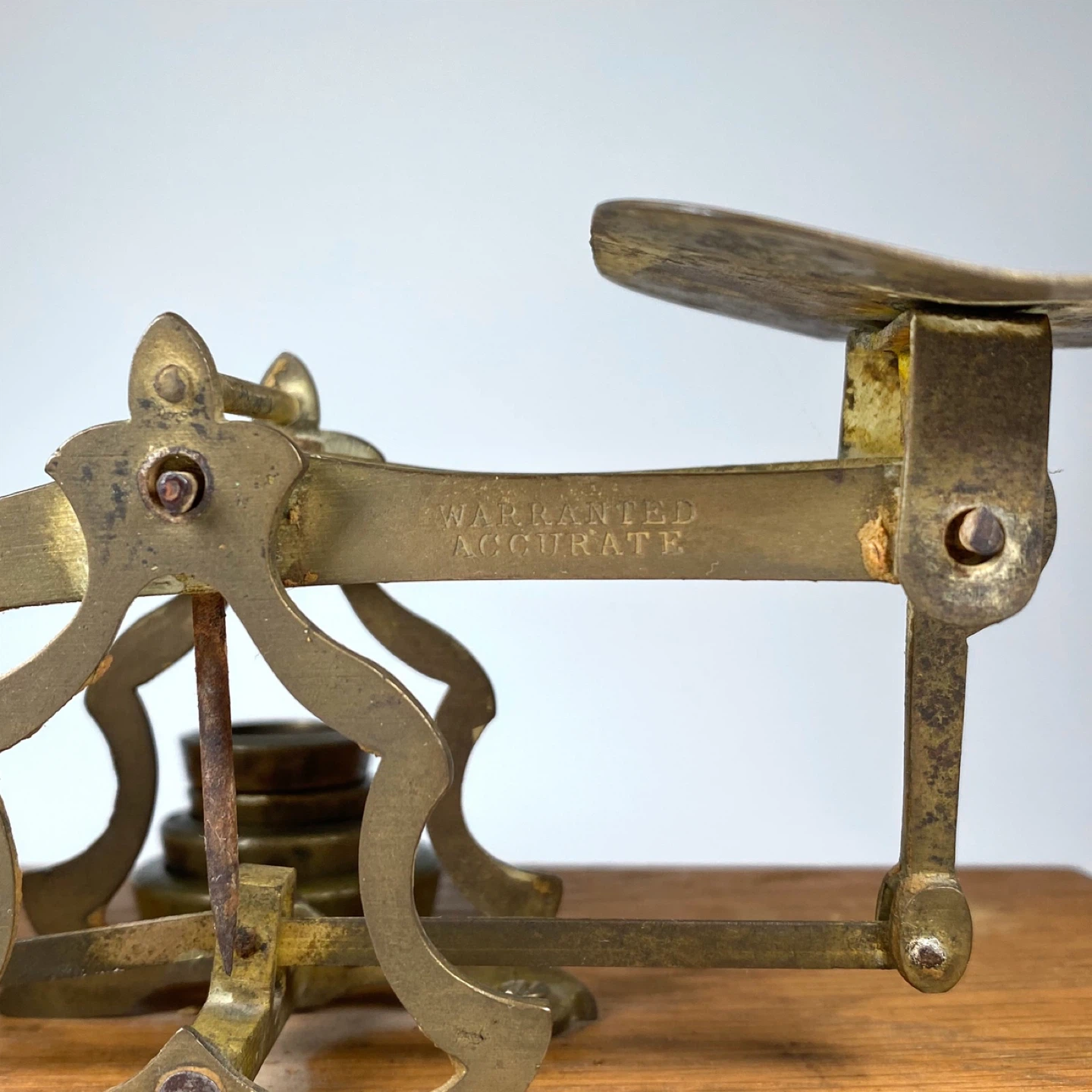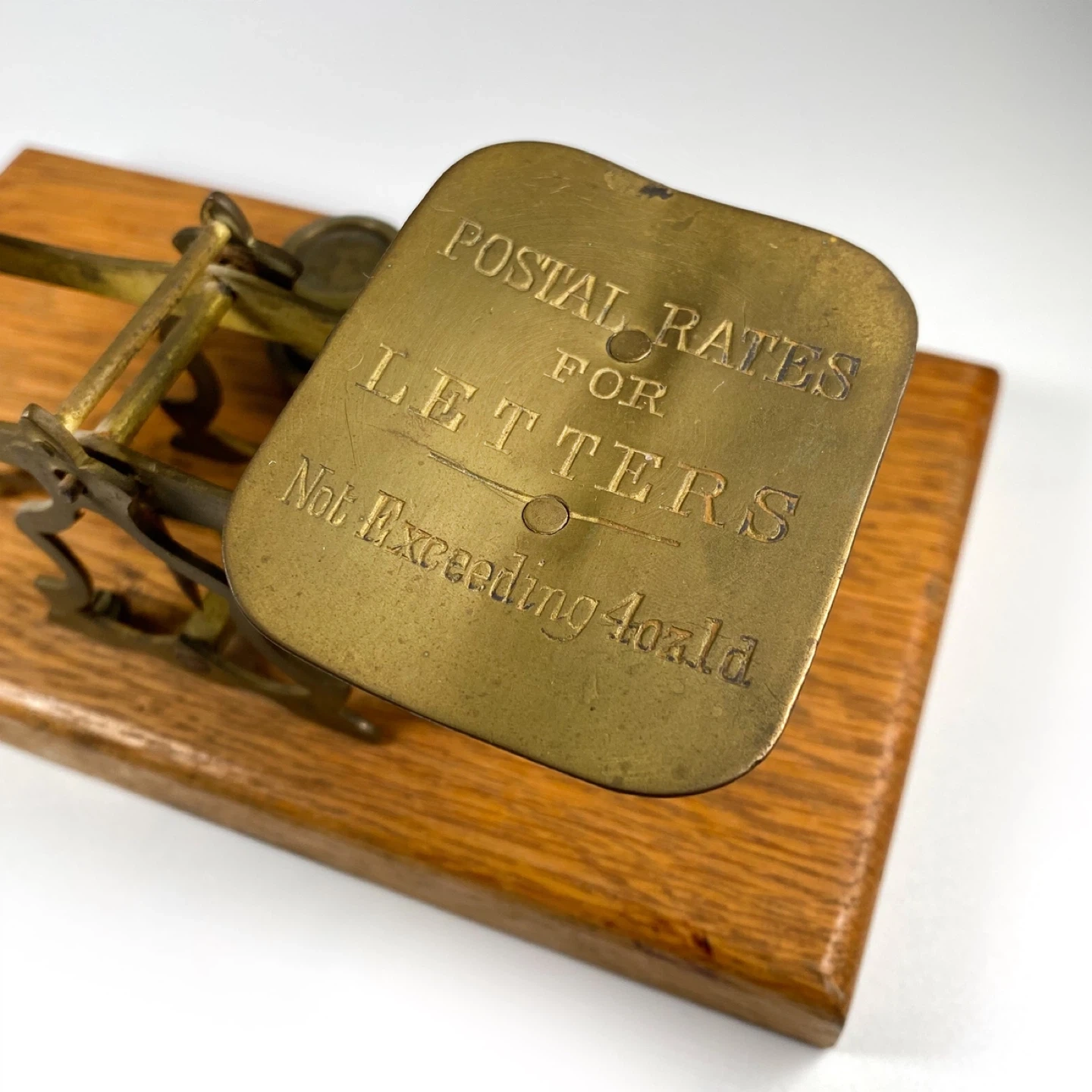 Antique 19th century British brass postal scale on oak base with 4 weights totaling 4oz.