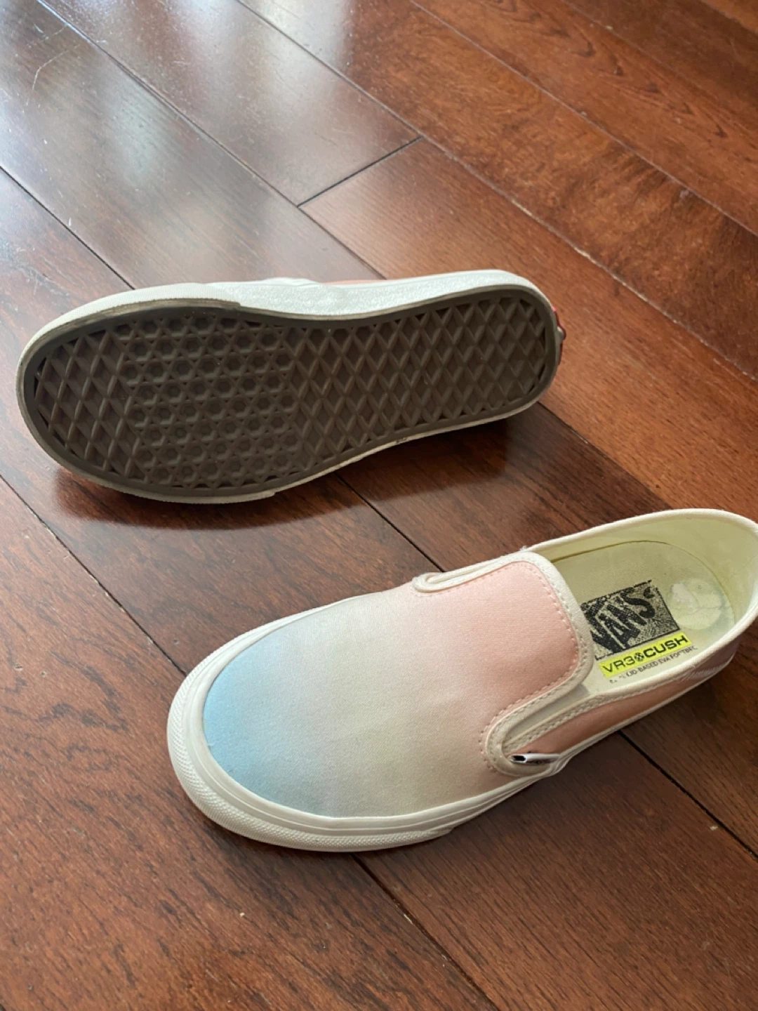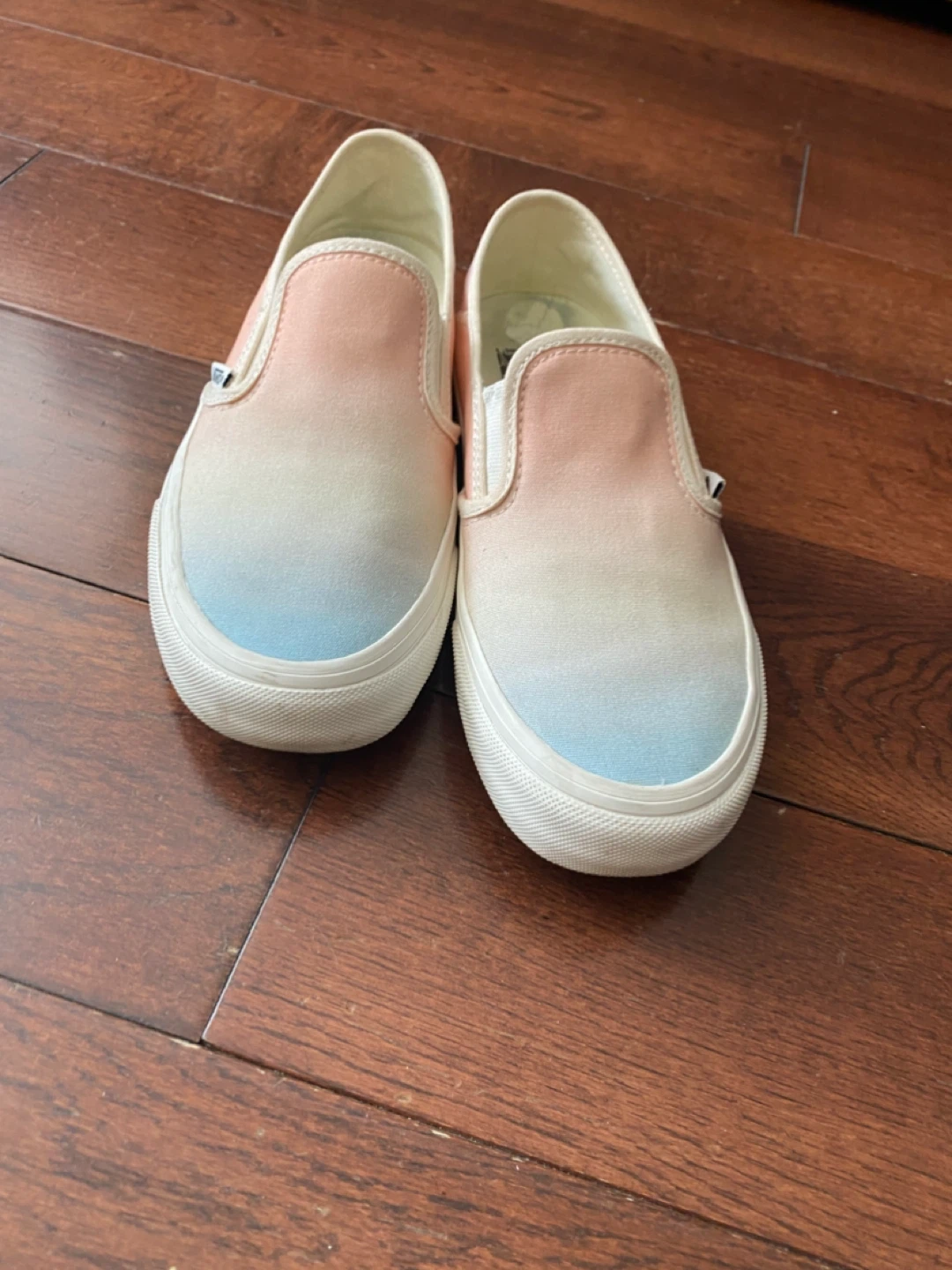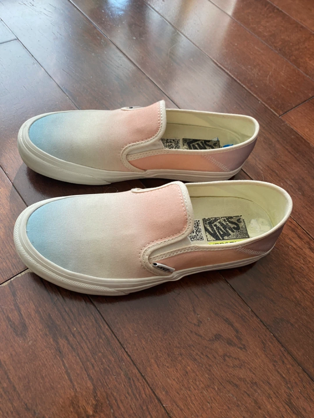 Selling a pair of Vans VR3 Cush slip-on shoes. They're a really cool gradient colour, fading from blue to pink. The size is Women's 7.5 US. These are in great shape!