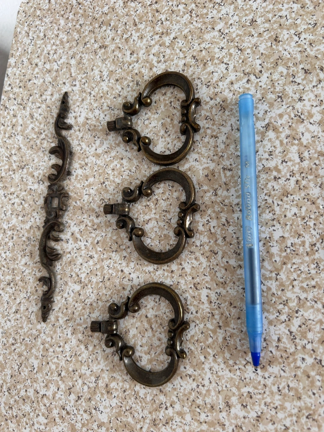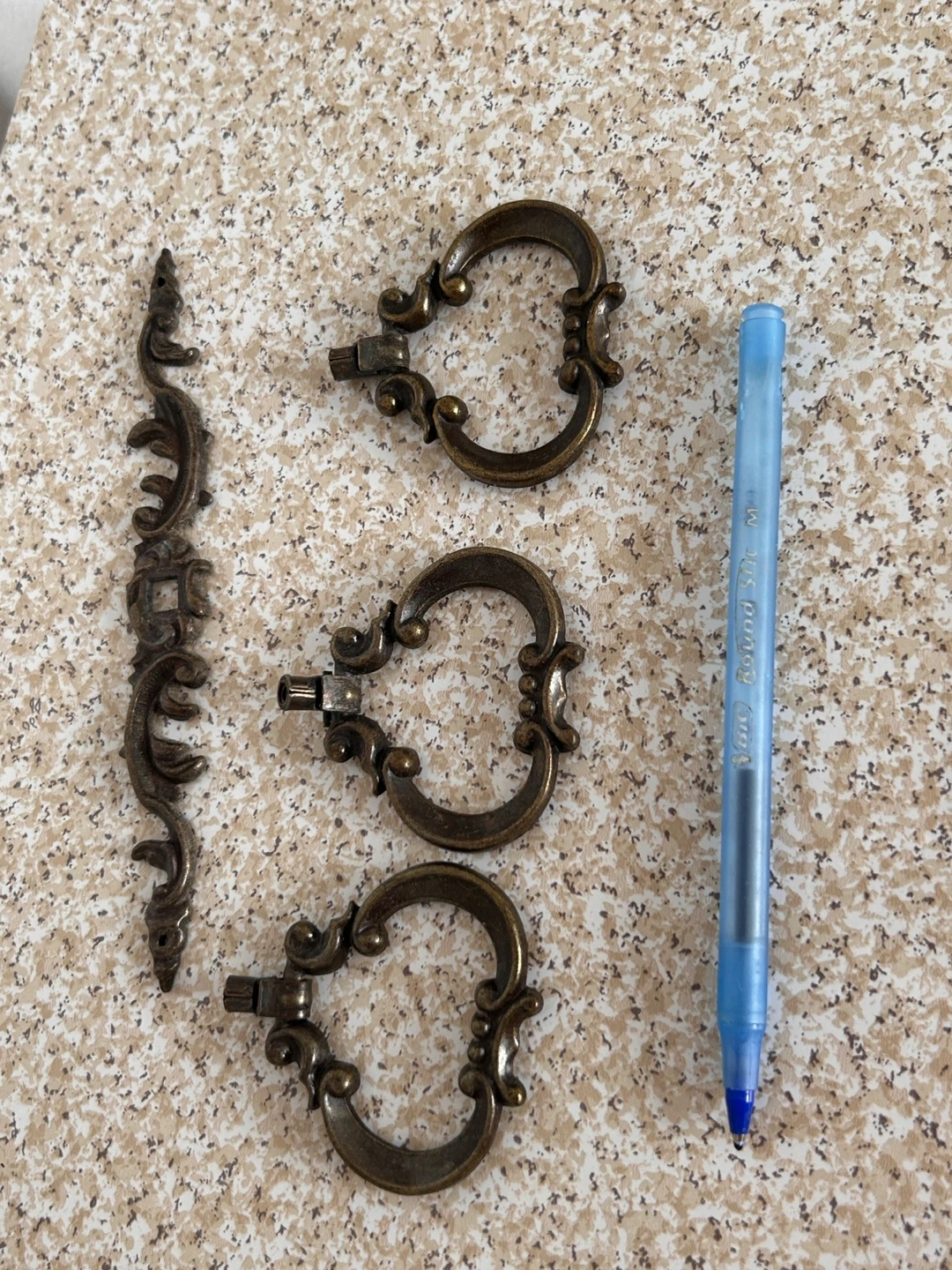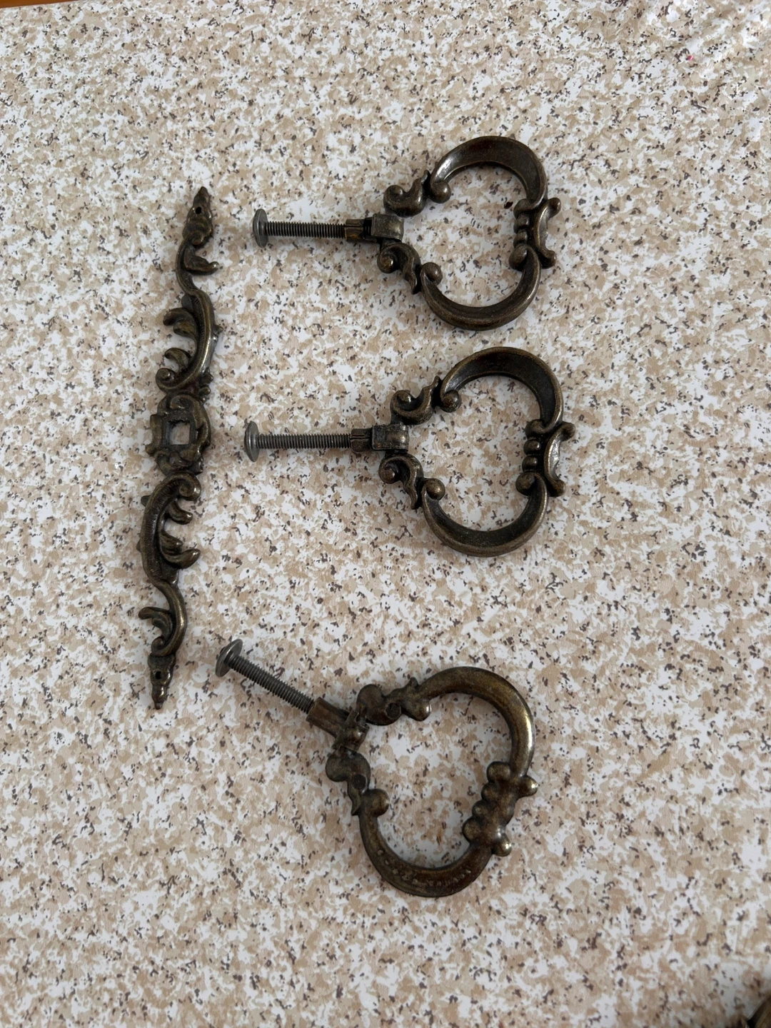 Selling a set of vintage bronze drawer pulls and handles. They have a beautiful ornate design and come with the screws for installation. Perfect for adding a touch of antique charm to your furniture!