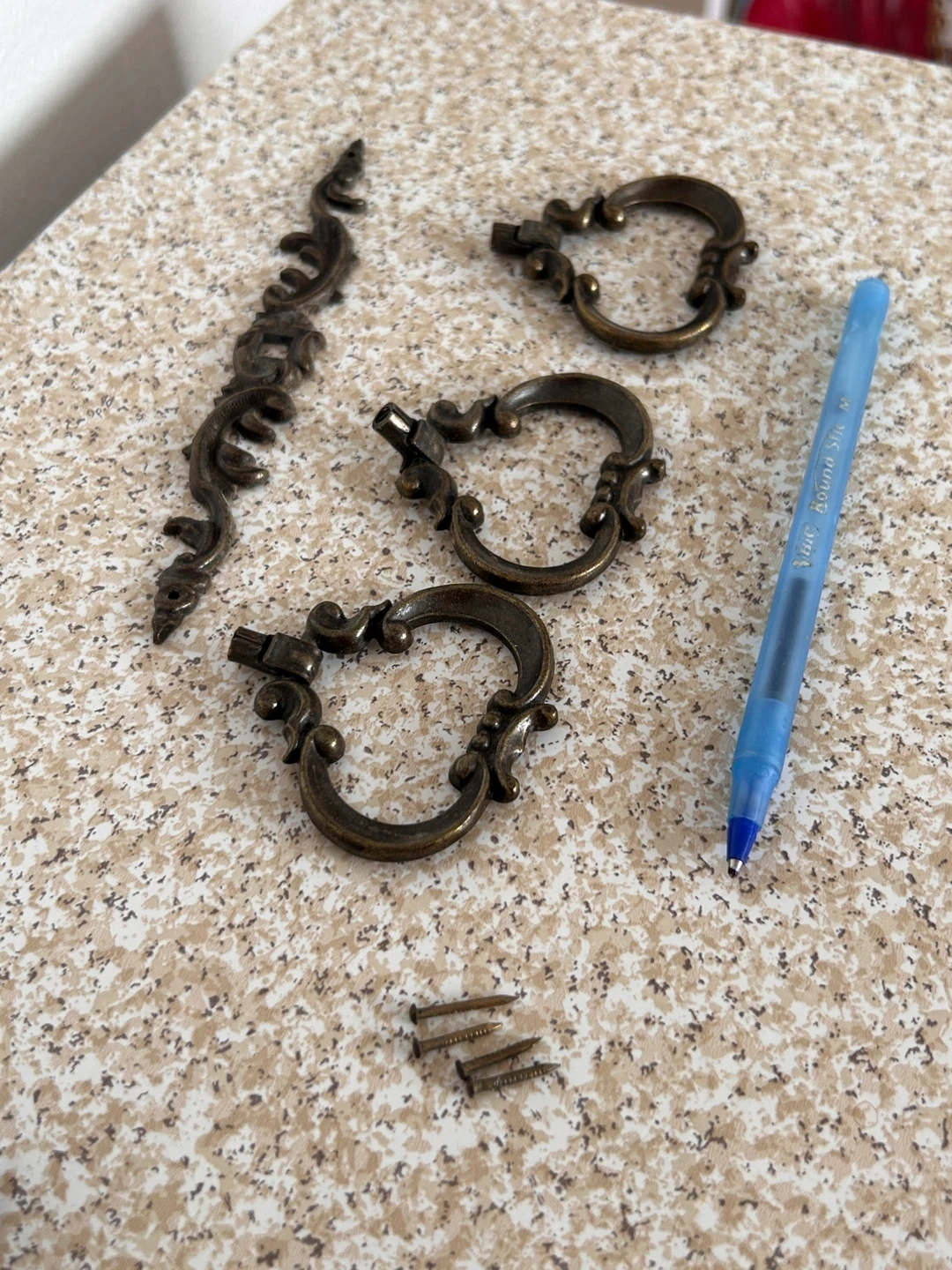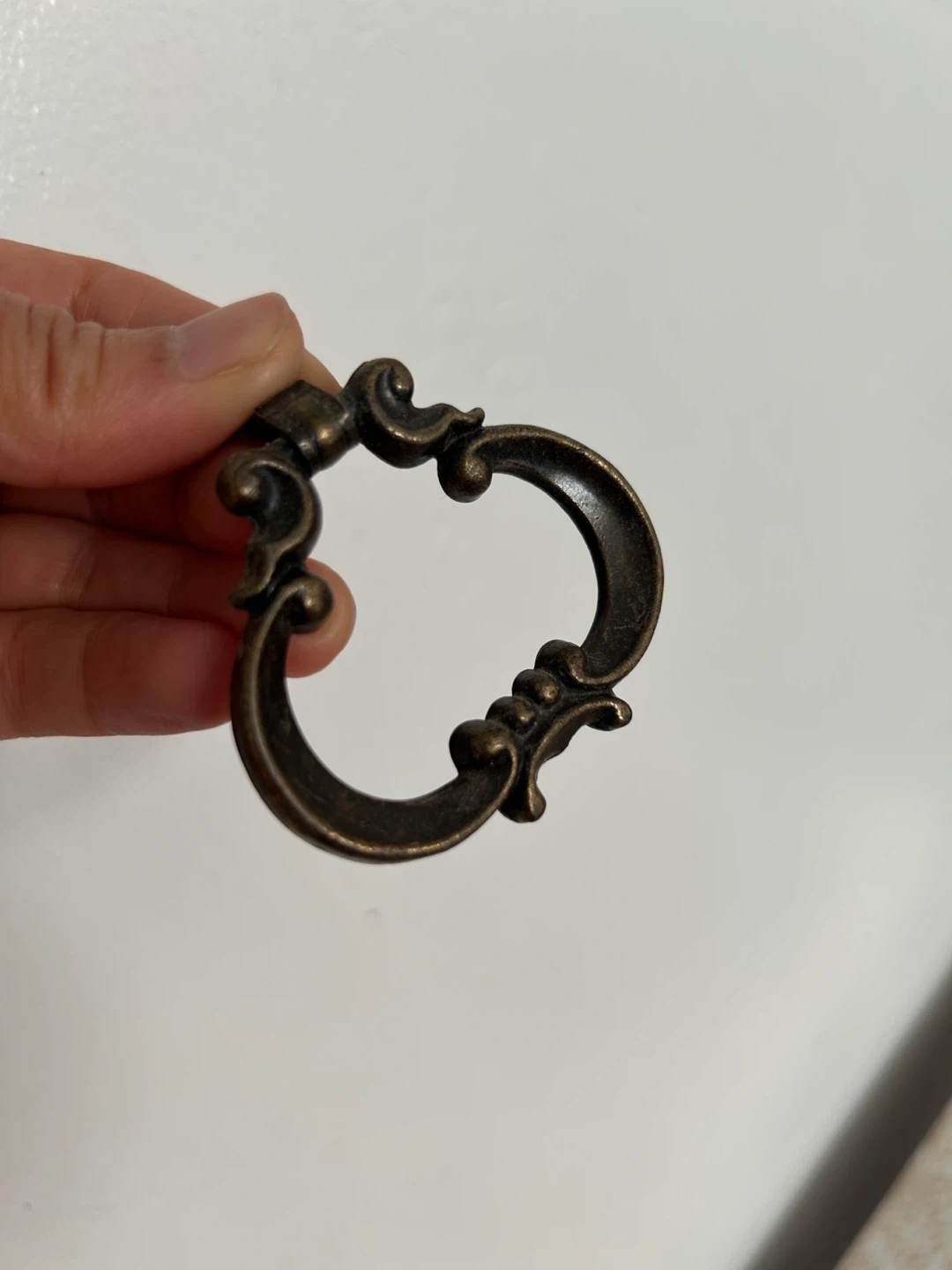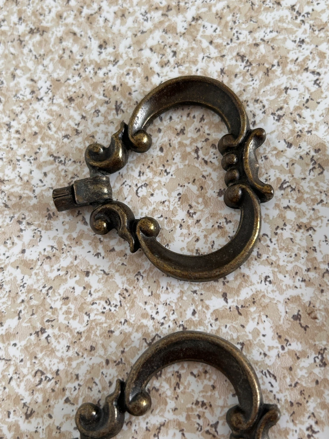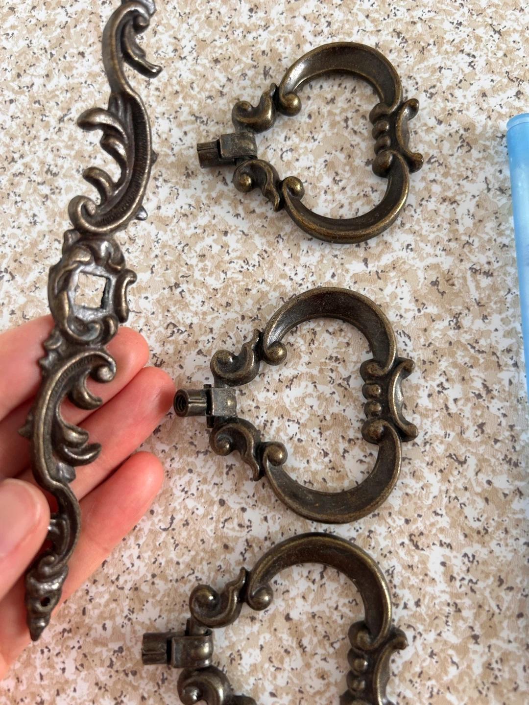 Selling a set of vintage bronze drawer pulls and handles. They have a beautiful ornate design and come with the screws for installation. Perfect for adding a touch of antique charm to your furniture!