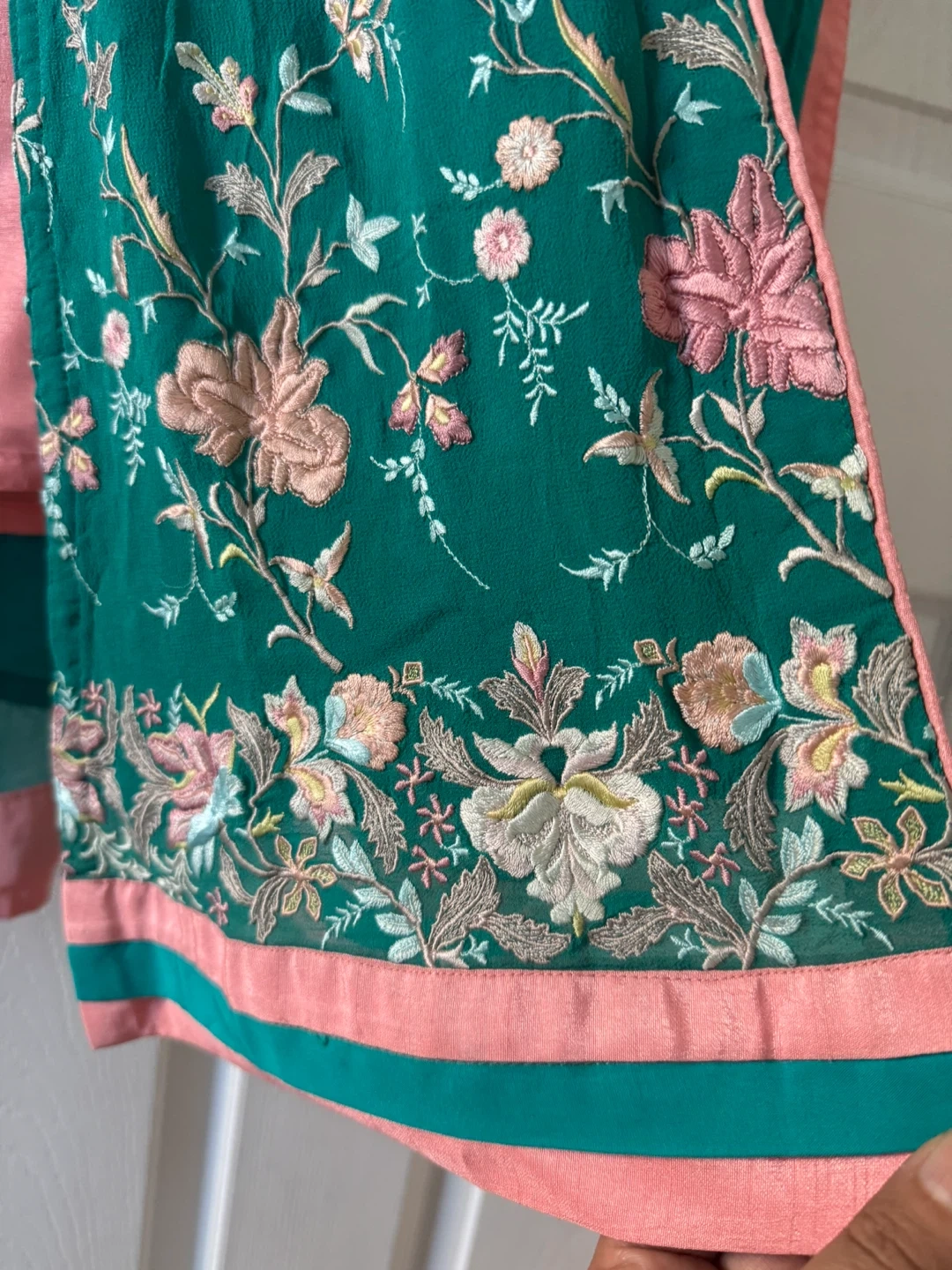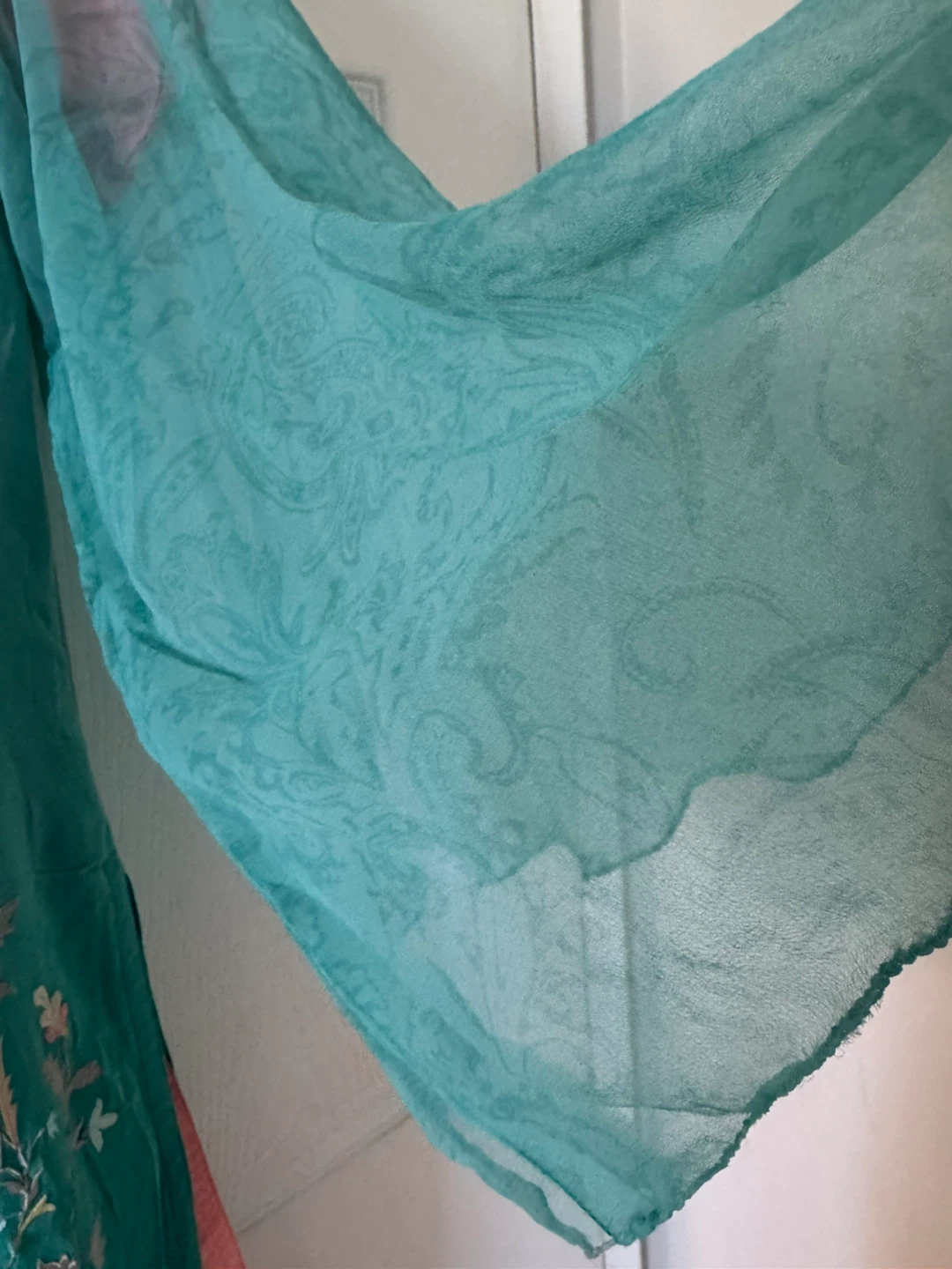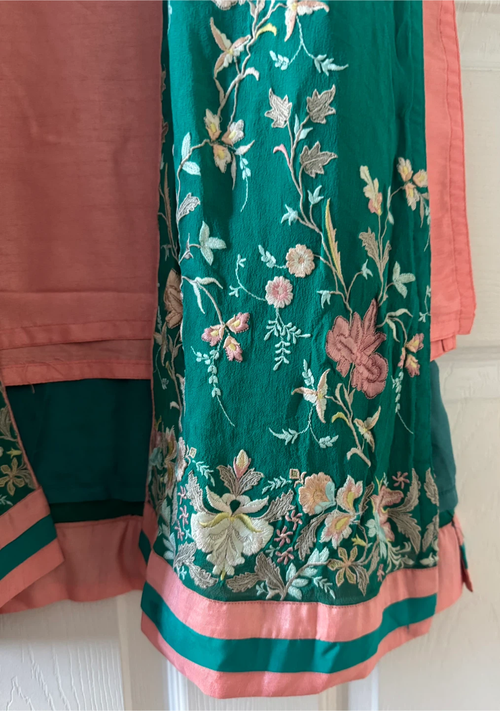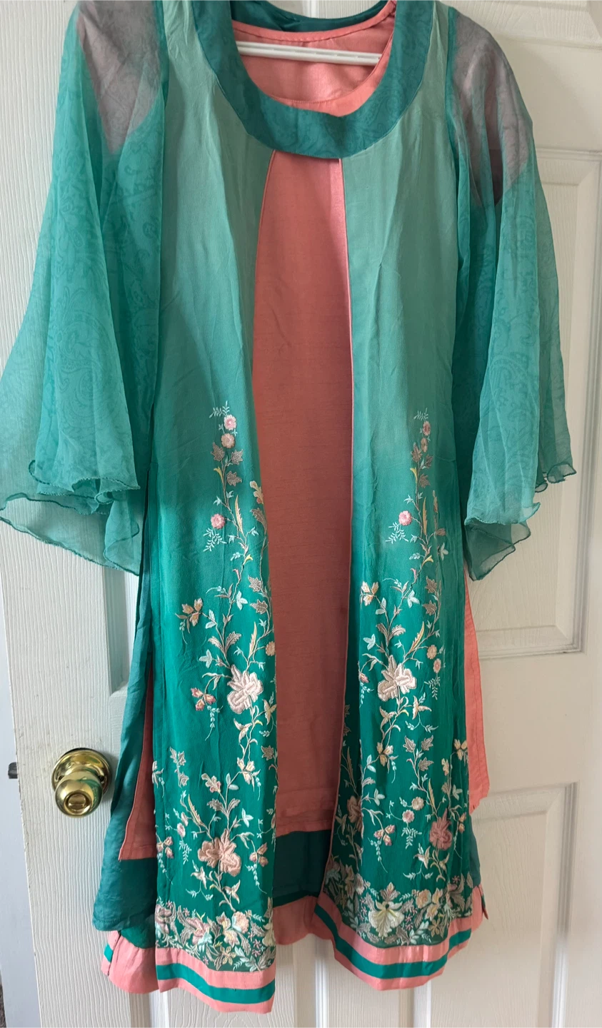 Beautiful salwar kameez featuring intricate floral embroidery on a lovely green fabric, complemented by peach accents. This outfit is perfect for special occasions or festive events. The flowing design and delicate details make it a standout piece in any wardrobe