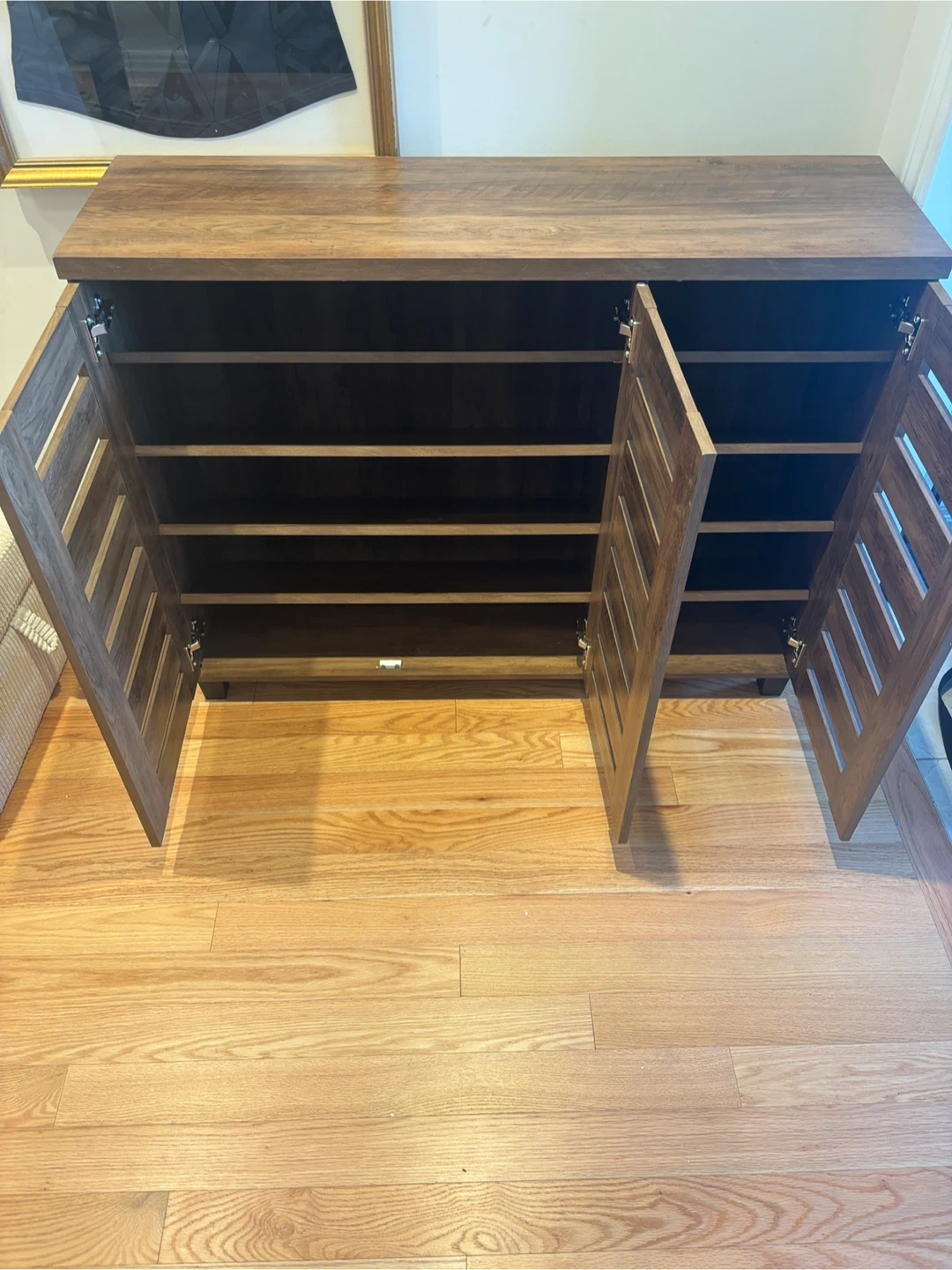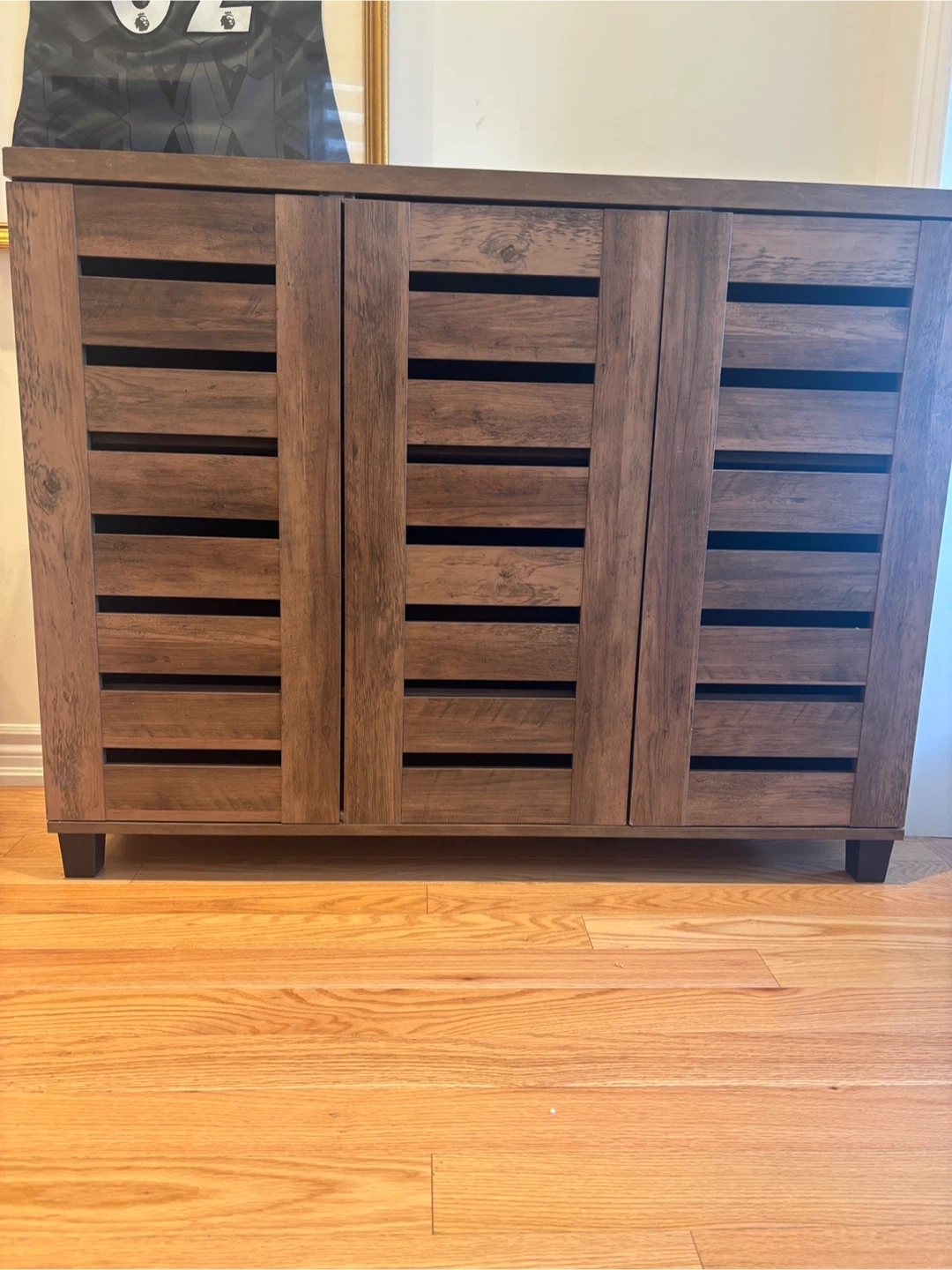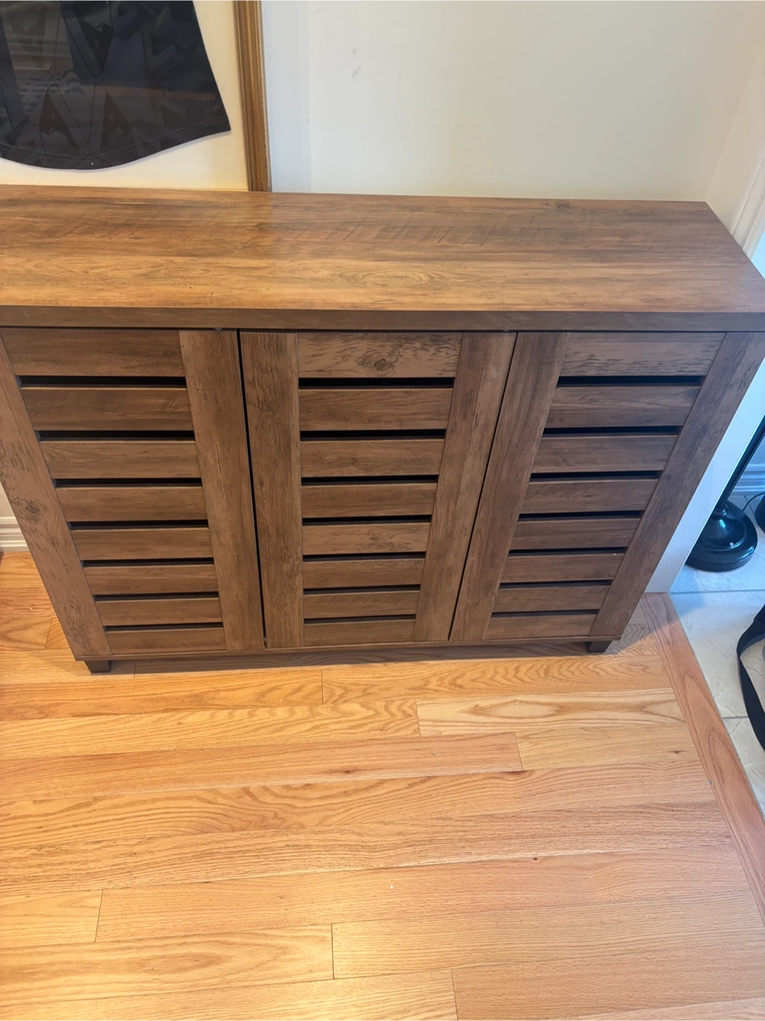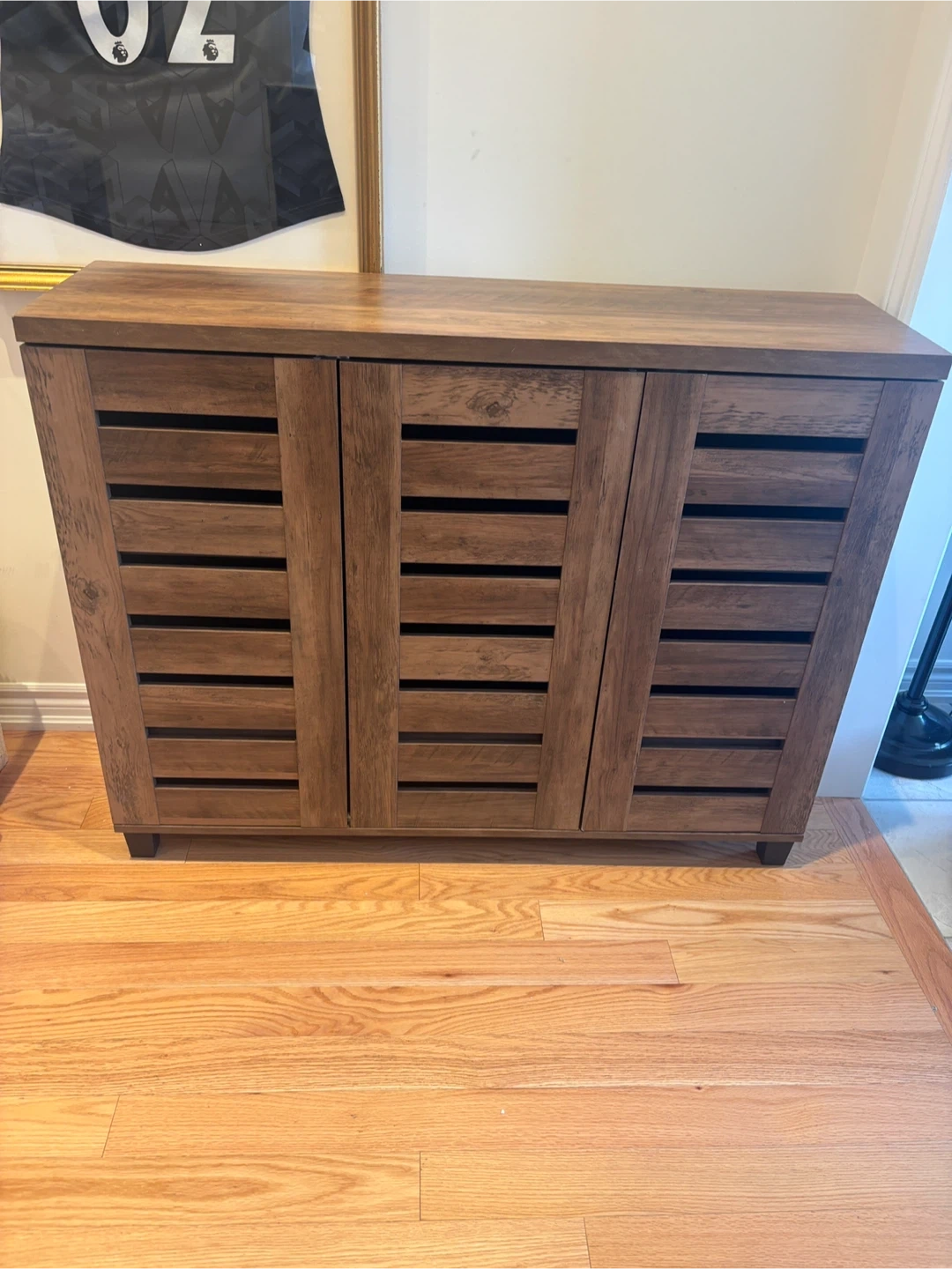 226Selling a wooden shoe cabinet or console /Entryway table. It has a beautiful wood finish and slat-style doors. It measures approximately 46 inches in length, offering ample storage space inside. Available for delivery and pickup
