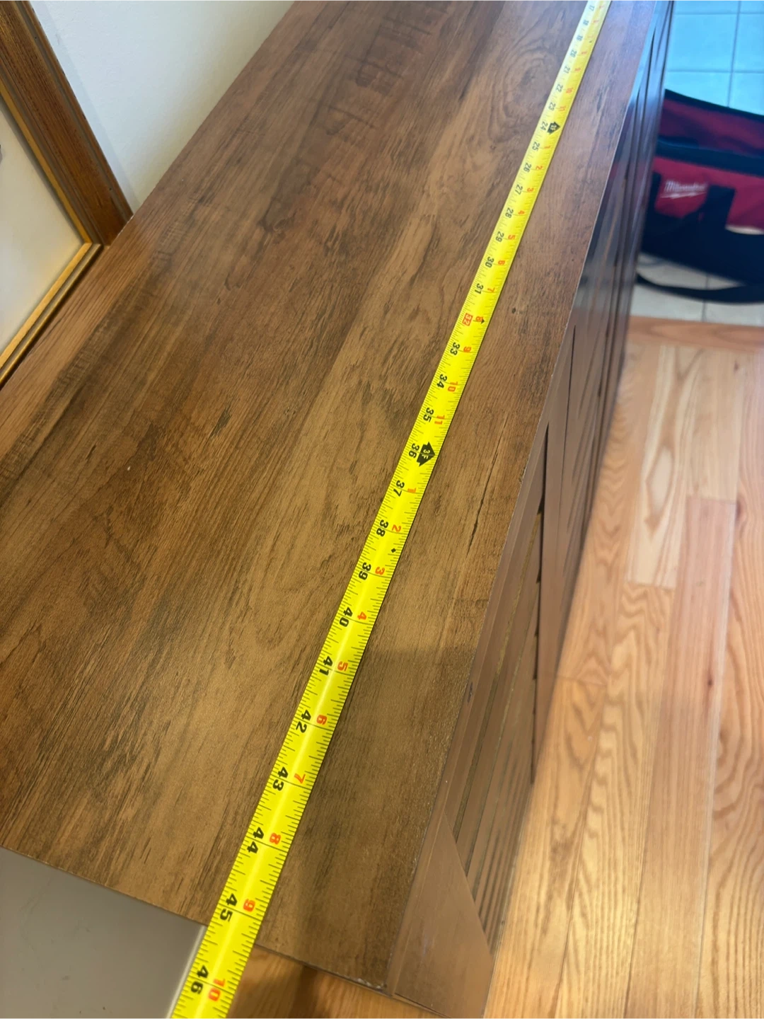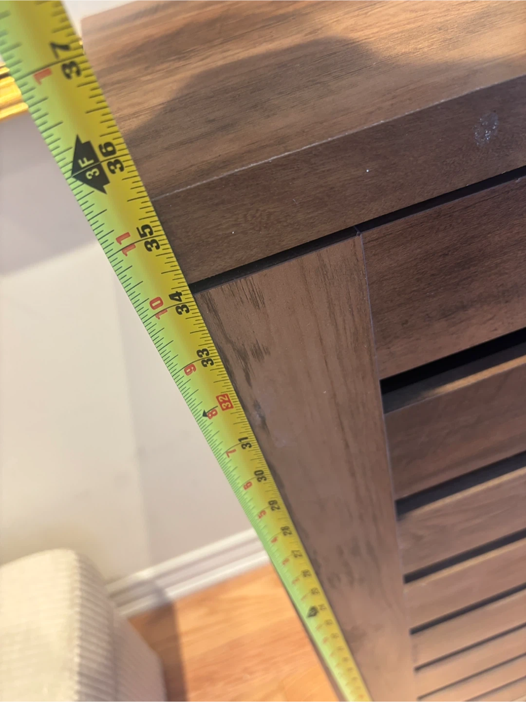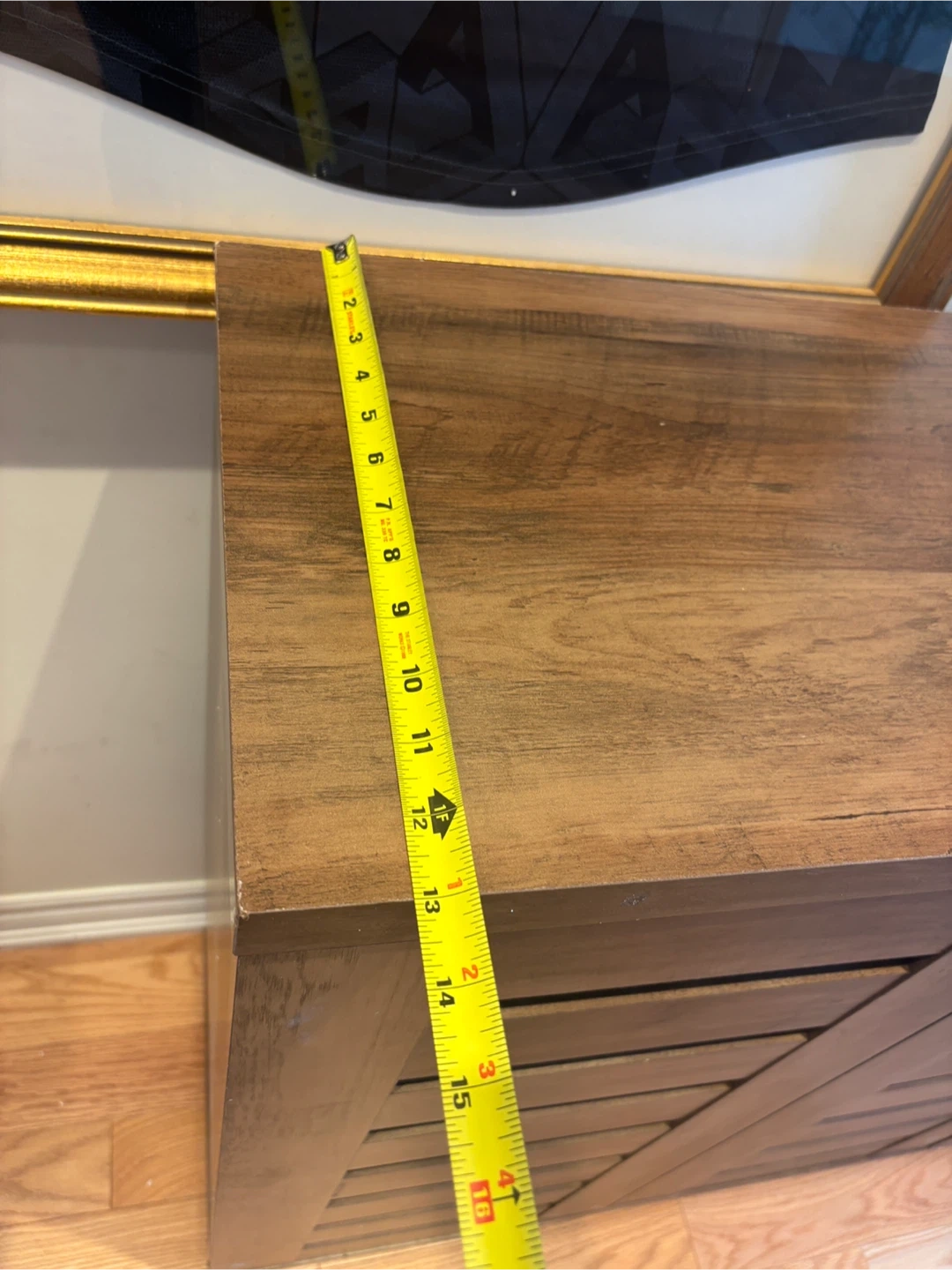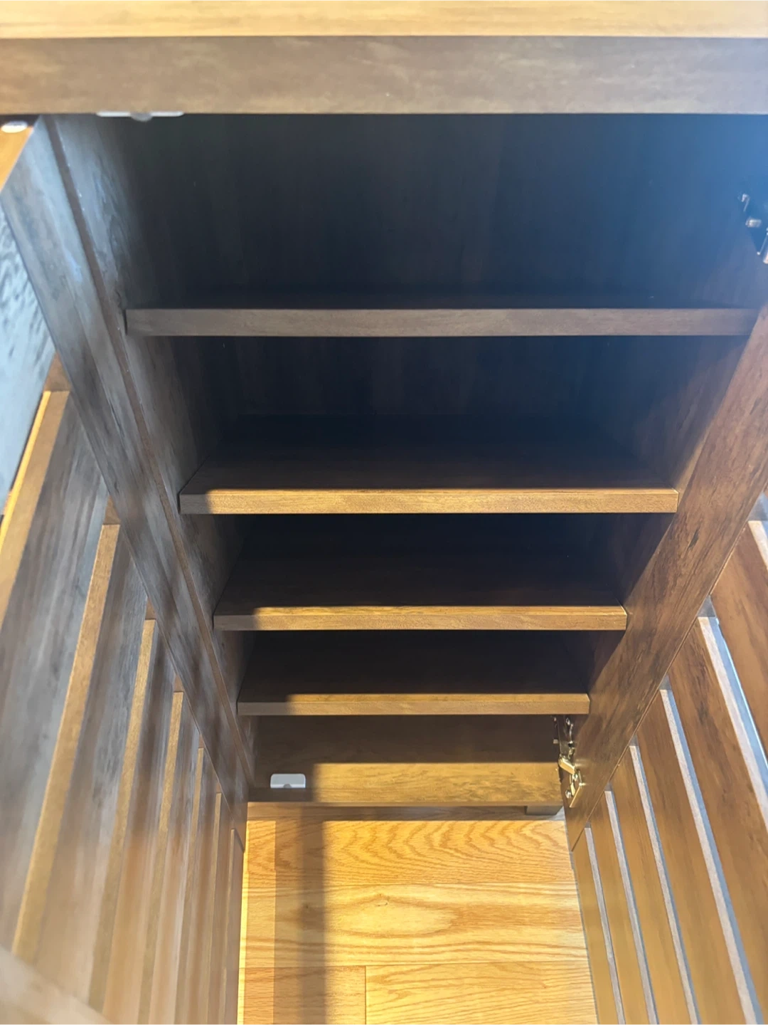 226Selling a wooden shoe cabinet or console /Entryway table. It has a beautiful wood finish and slat-style doors. It measures approximately 46 inches in length, offering ample storage space inside. Available for delivery and pickup