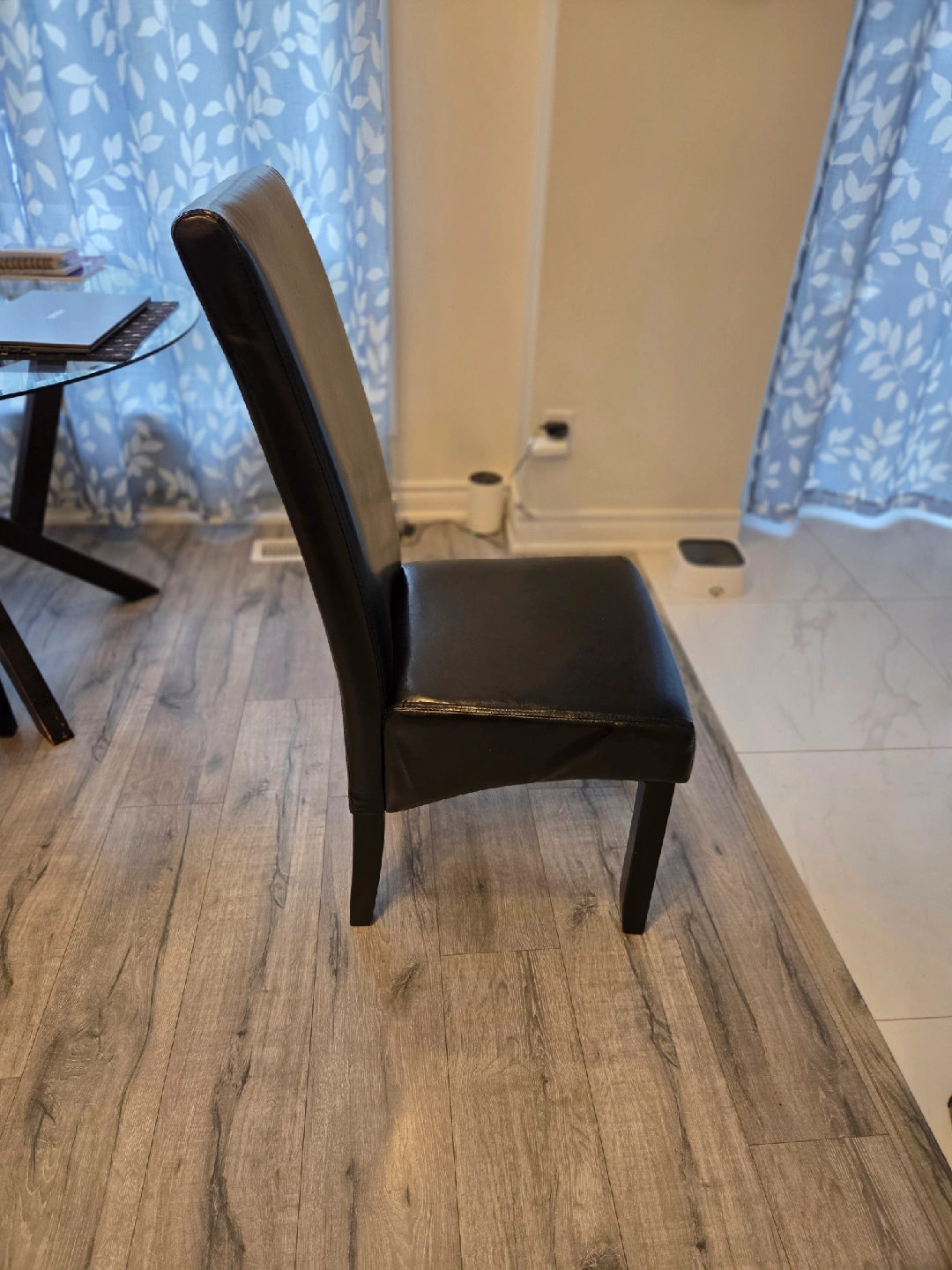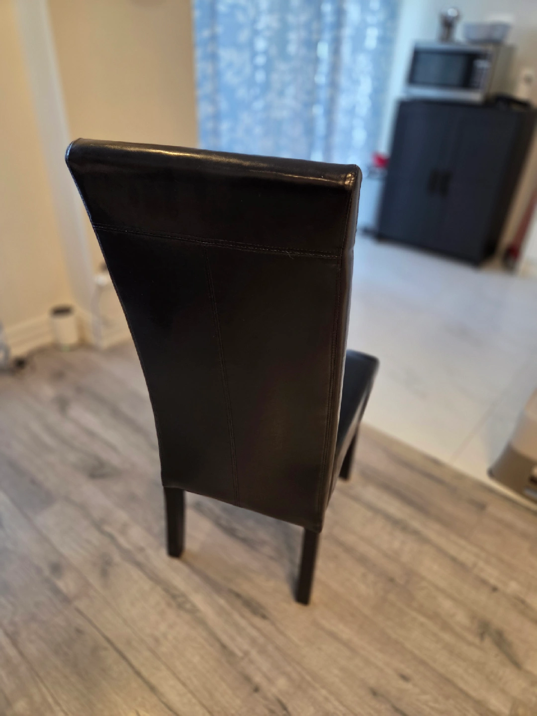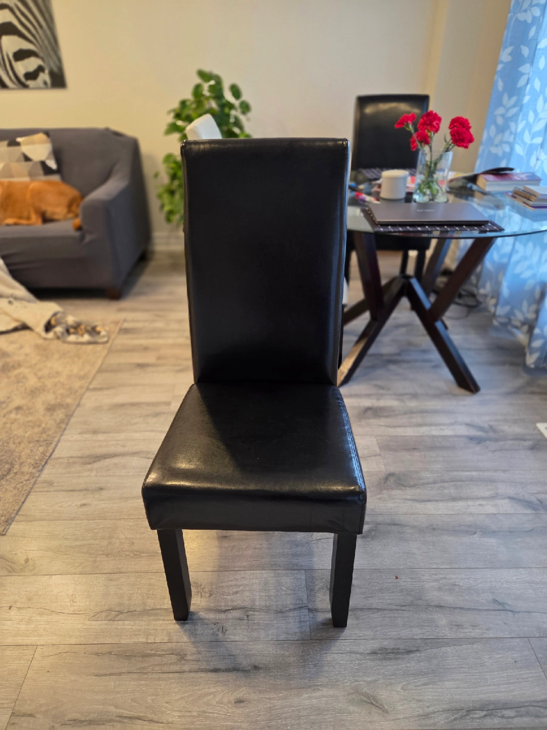 Selling a black dining chair that's in good condition. It's a simple and stylish chair that would look great in any dining room. The chair is made of a sturdy material and is very comfortable to sit in. Perfect for everyday meals or special occasions!
