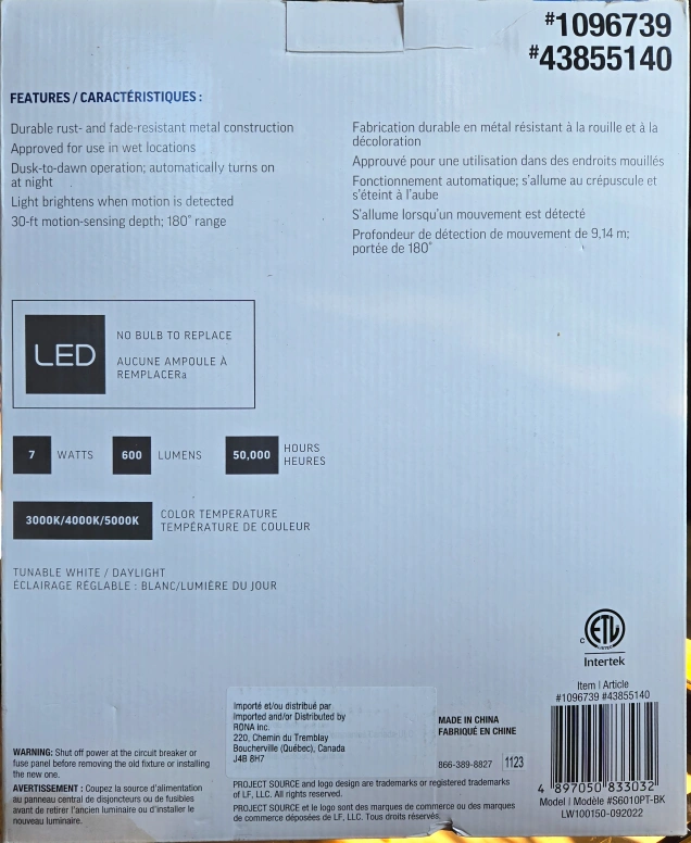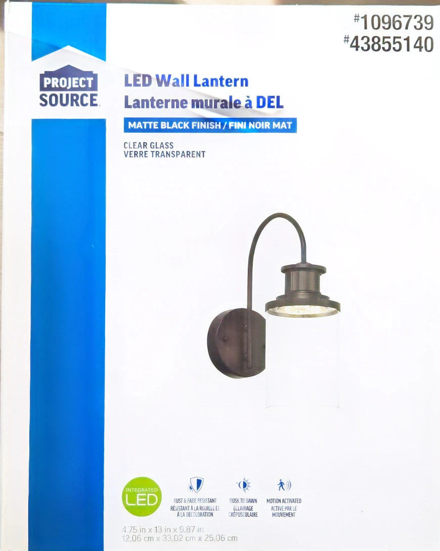 This Project Source LED Wall Lantern features a matte black finish and clear glass. It's durable, rust- and fade-resistant, making it perfect for wet locations. It has a dusk-to-dawn operation and a 30-ft motion-sensing depth with a 180Β° range. The integrated LED uses 7 watts, 600 lumens, and lasts for 50,000 hours. Dimensions are 4.75 in x 13 in x 9.87 in (12.06 cm x 33.02 cm x 25.06 cm).
