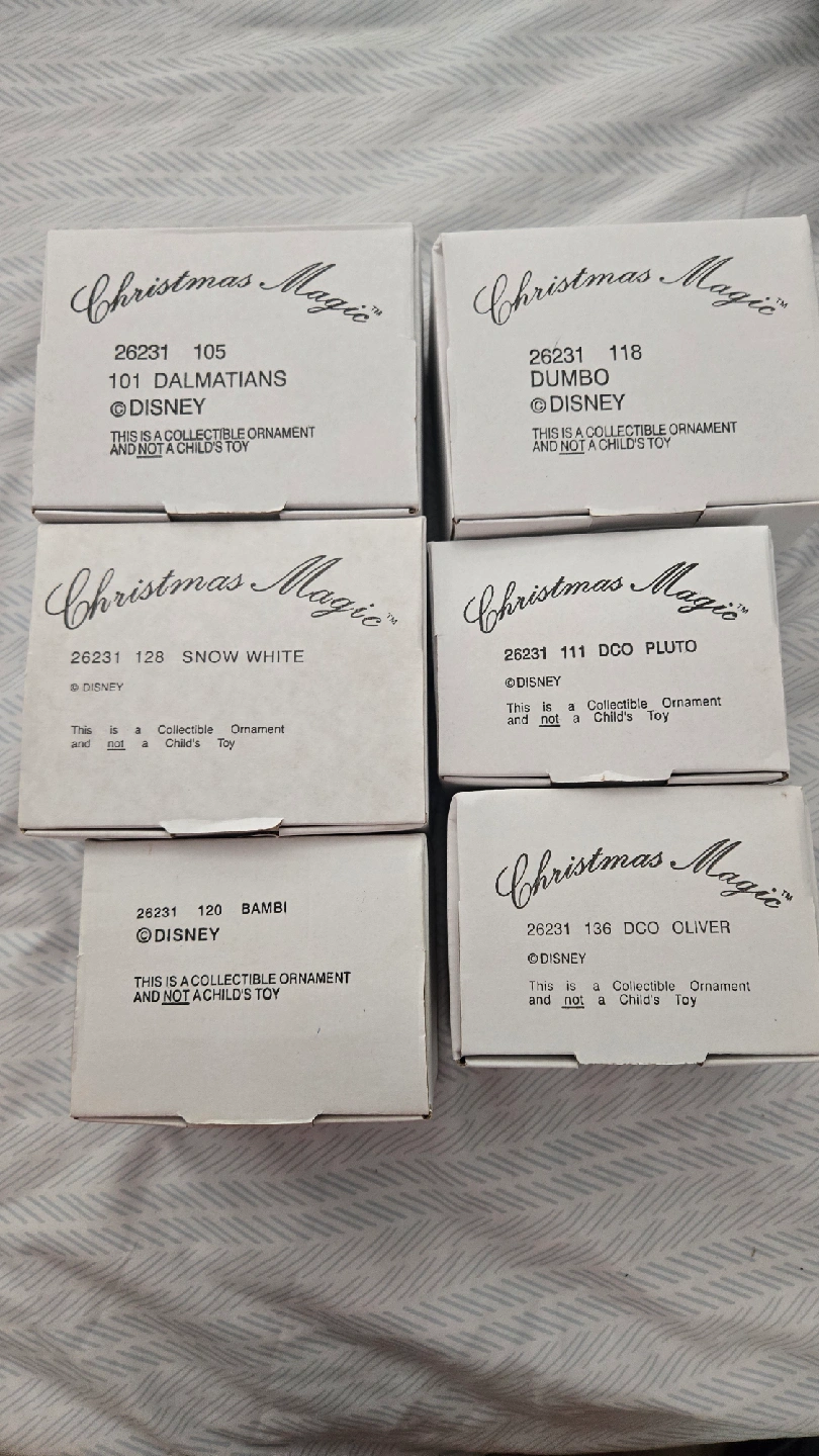 10Selling a set of 6 Disney Christmas Magic collectible ornaments! Each ornament comes in its original box. Included in the set: - 101 Dalmatians - Dumbo - Snow White - Pluto - Bambi - Oliver These ornaments are new and ready to add some Disney magic to your Christmas tree 15 each or 75 all