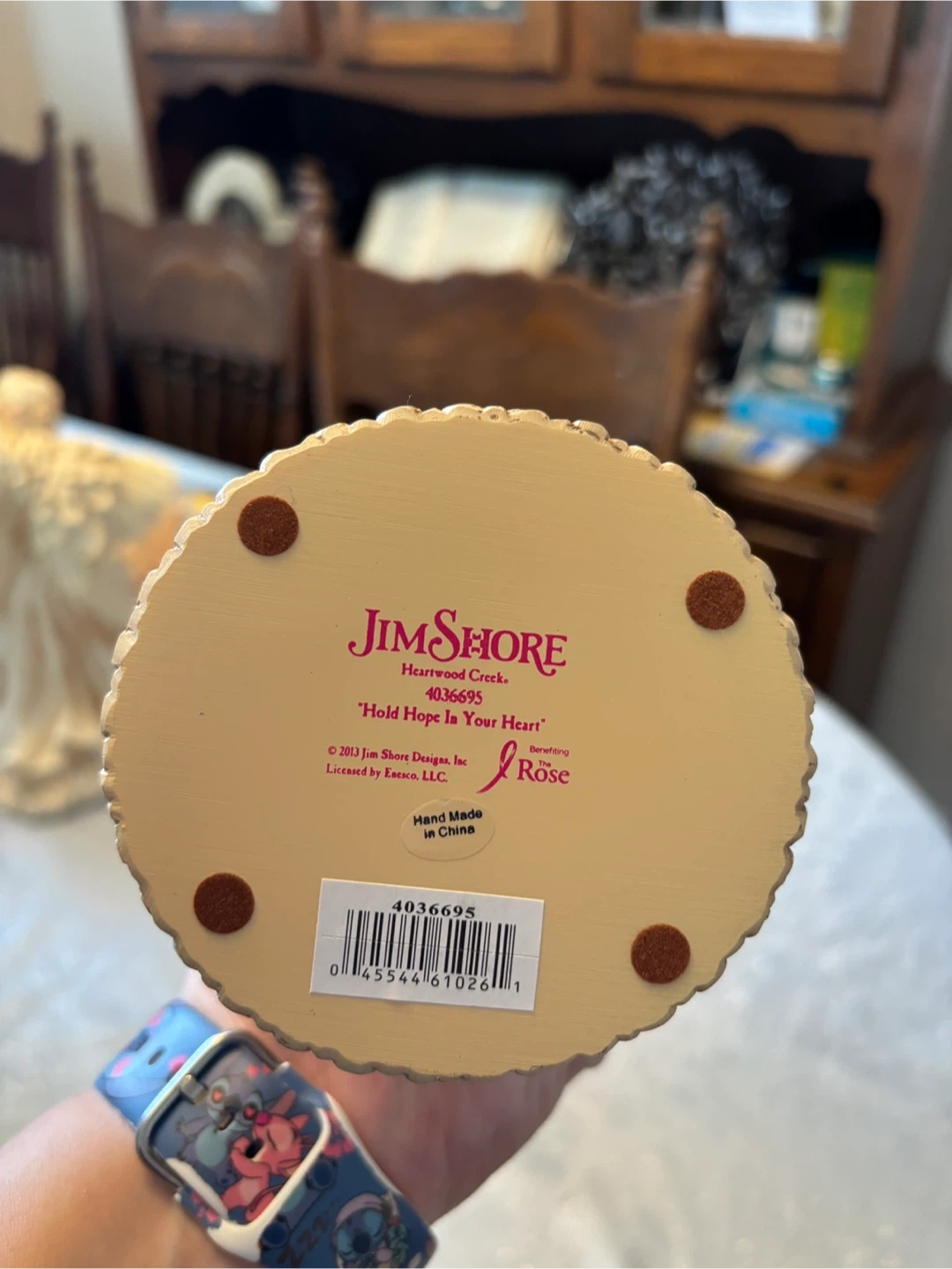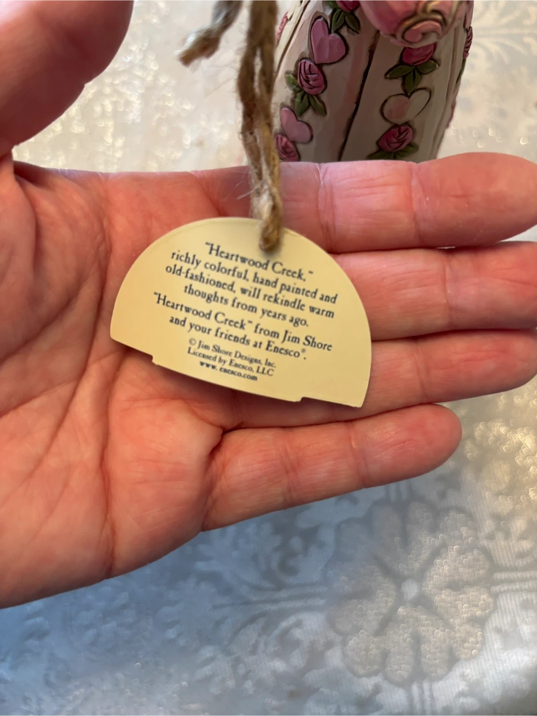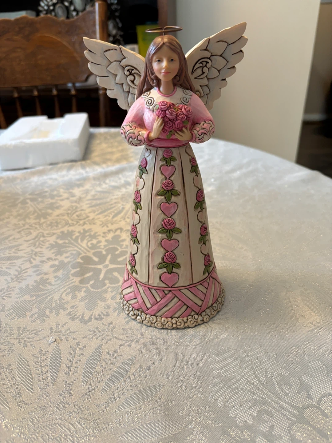 This is a Jim Shore Heartwood Creek angel figurine. It's richly colourful, hand painted and old-fashioned, will rekindle warm thoughts from years ago. This item is from Jim Shore and your friends at Enesco. The item is hand made in China. Still in styrofoam packaging
