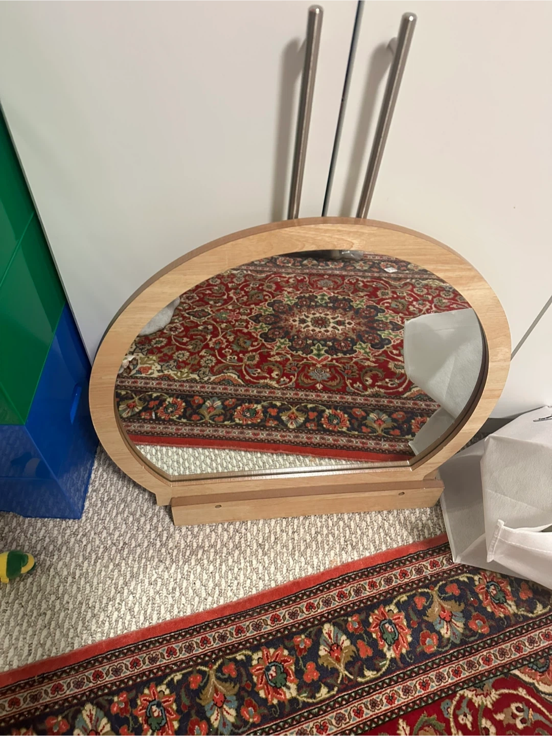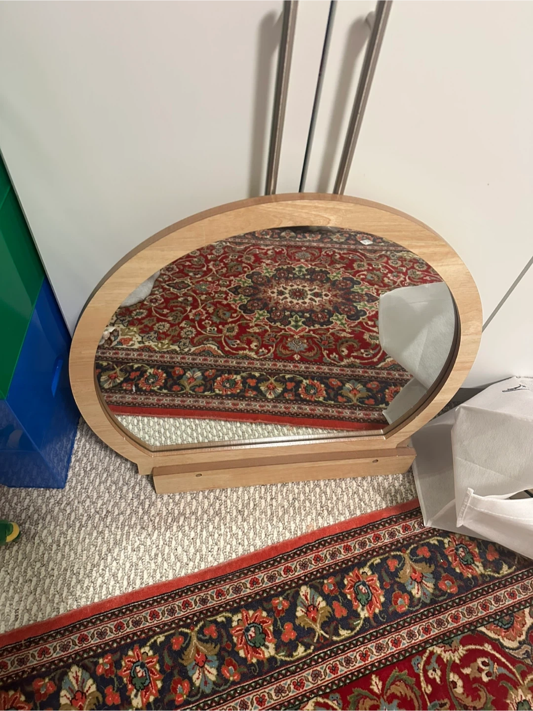 Selling a lovely oval vanity mirror with a wood frame! It's in great condition and would look perfect on a dresser or vanity table. The natural wood finish gives it a warm and inviting feel. Perfect for adding a touch of elegance to your space
