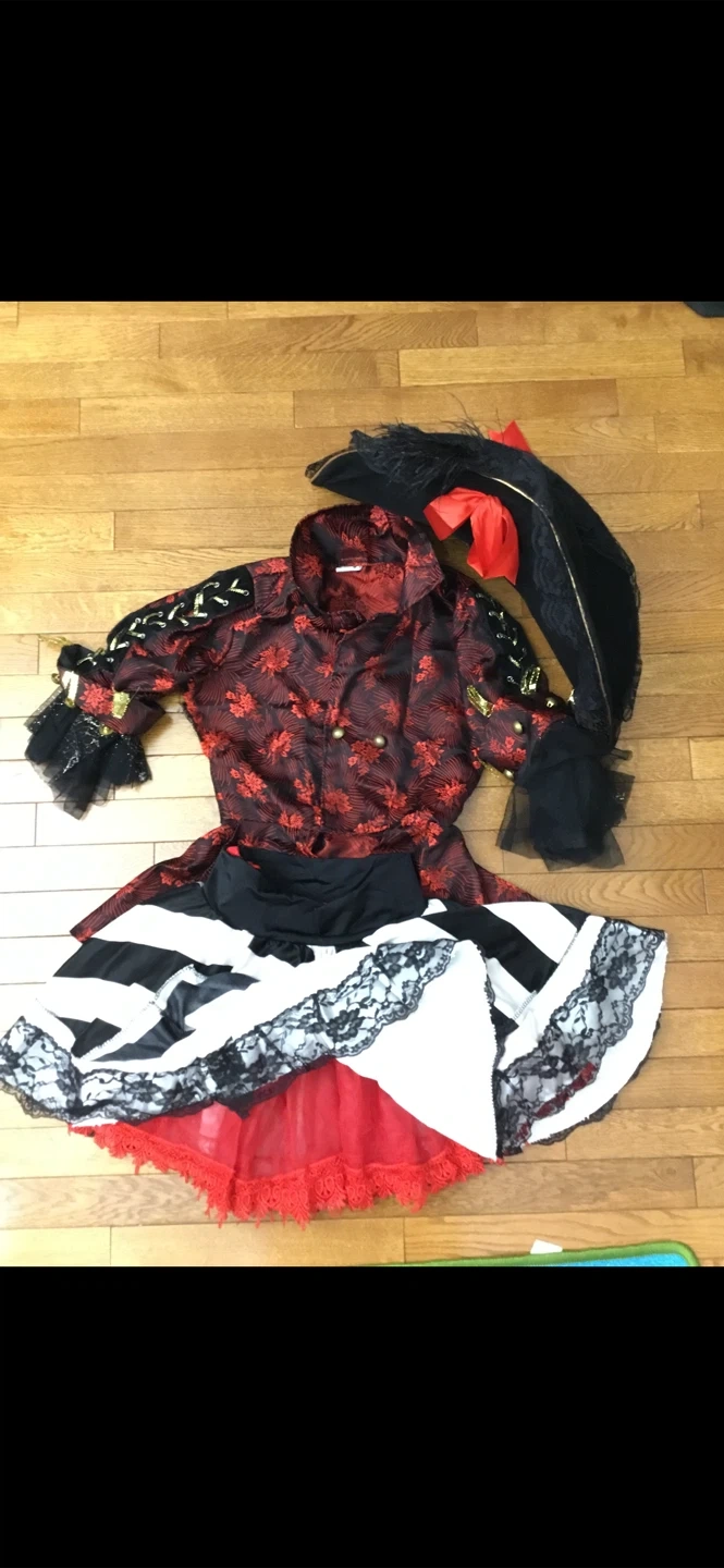 Here's a fun costume dress with a matching hat! The dress is red and black with lace detailing. Perfect for Halloween or cosplay!