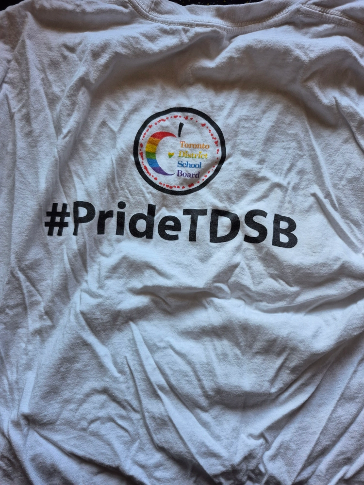 Selling a white ATC The Authentic T-Shirt Company shirt in size large. It has a colourful graphic on the front and a Toronto District School Board #PrideTDSB logo on the back