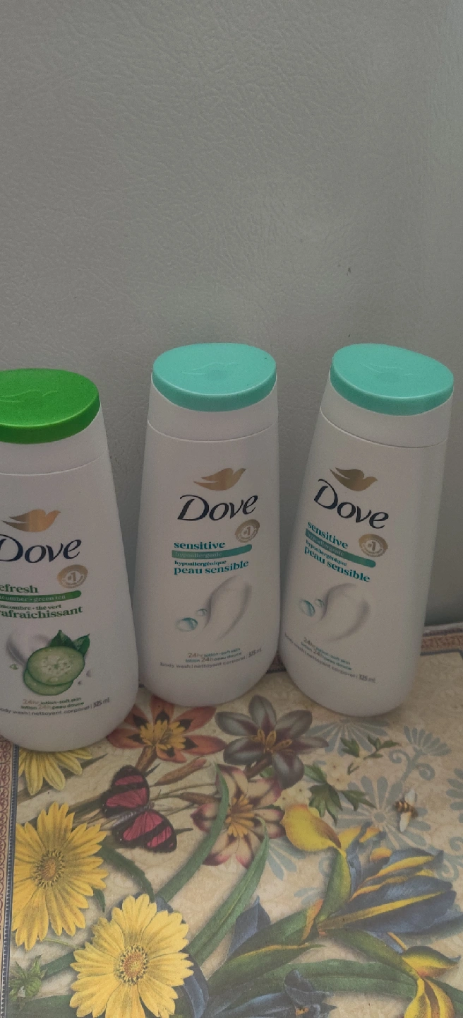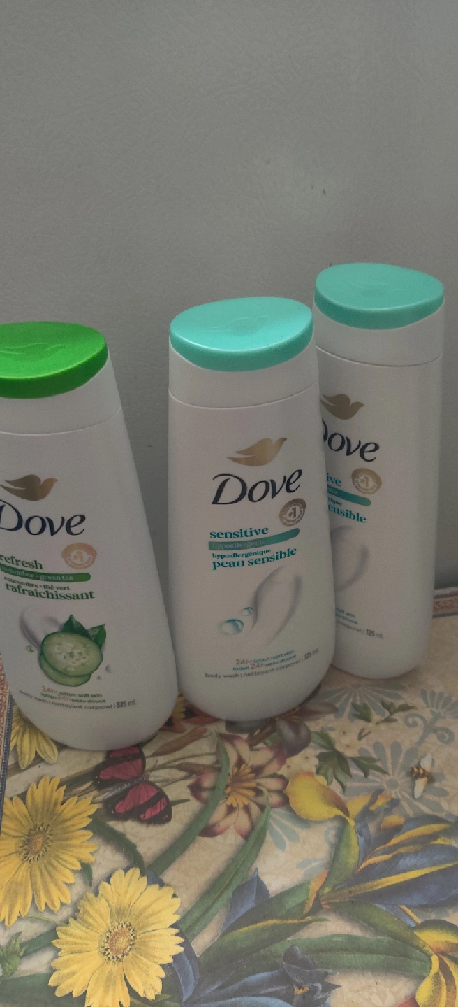 Selling 3 bottles of Dove Refresh body wash in the cucumber and green tea scent. Each bottle is 325 mL. Perfect for trying out a new scent or stocking up on a favourite! This body wash is designed to leave your skin feeling soft and refreshed with a 24hr lotion-soft skin formula