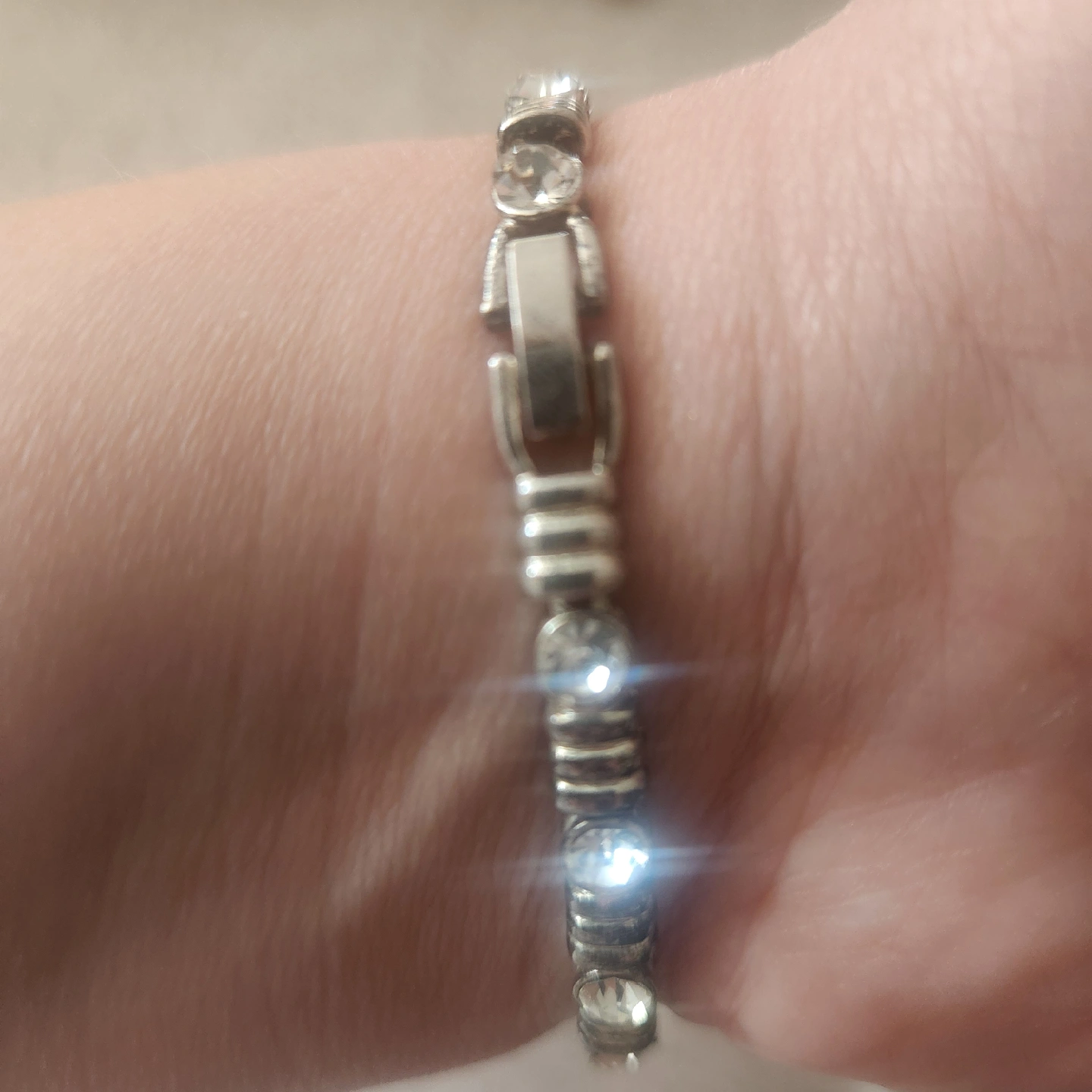 282Selling a silver-tone bracelet with rhinestone detailing. It's in good condition and would make a lovely accessory for any outfit!