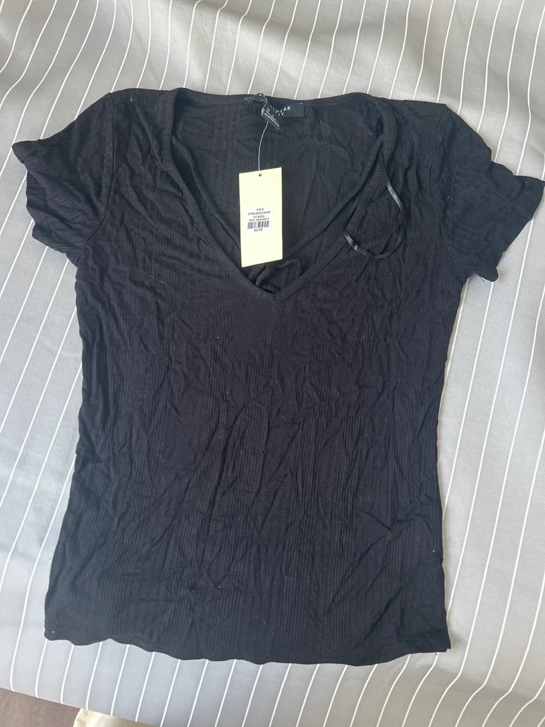 Selling a cute black ribbed V-neck top from Lunar City! It's in great condition and would be a stylish addition to your wardrobe. The tag shows it was originally $9.99