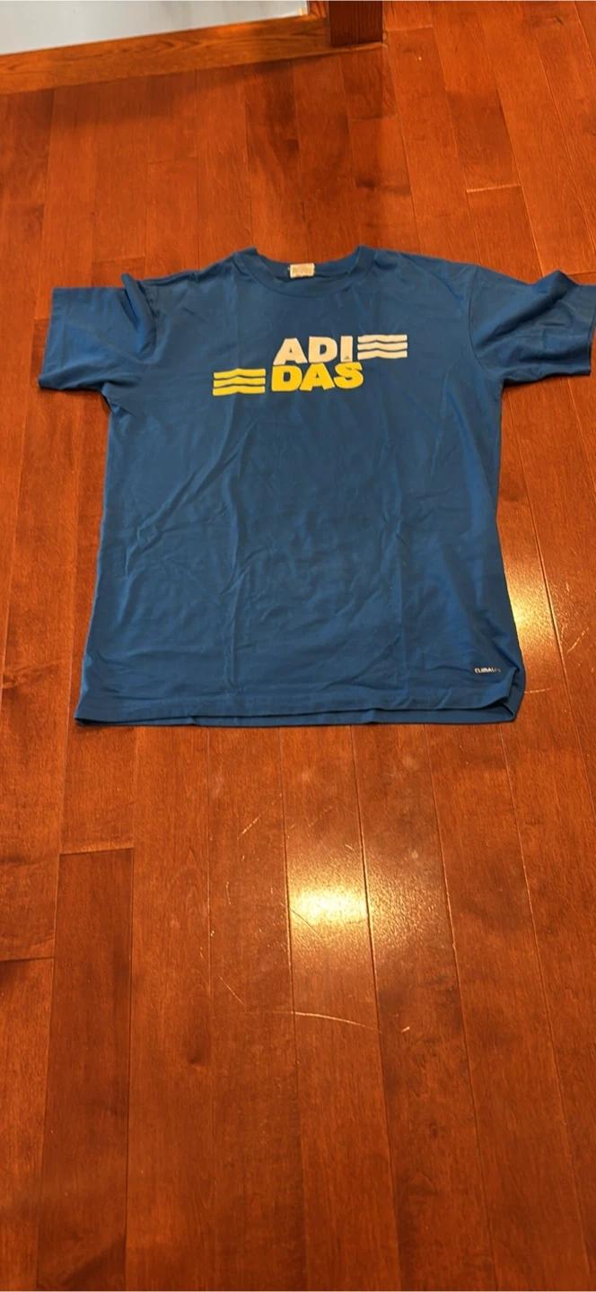 Here's a blue Adidas t-shirt for sale! It has the Adidas logo in yellow and white on the front. It’s a size large, but would fit closer to a medium for men. Made in Canada.