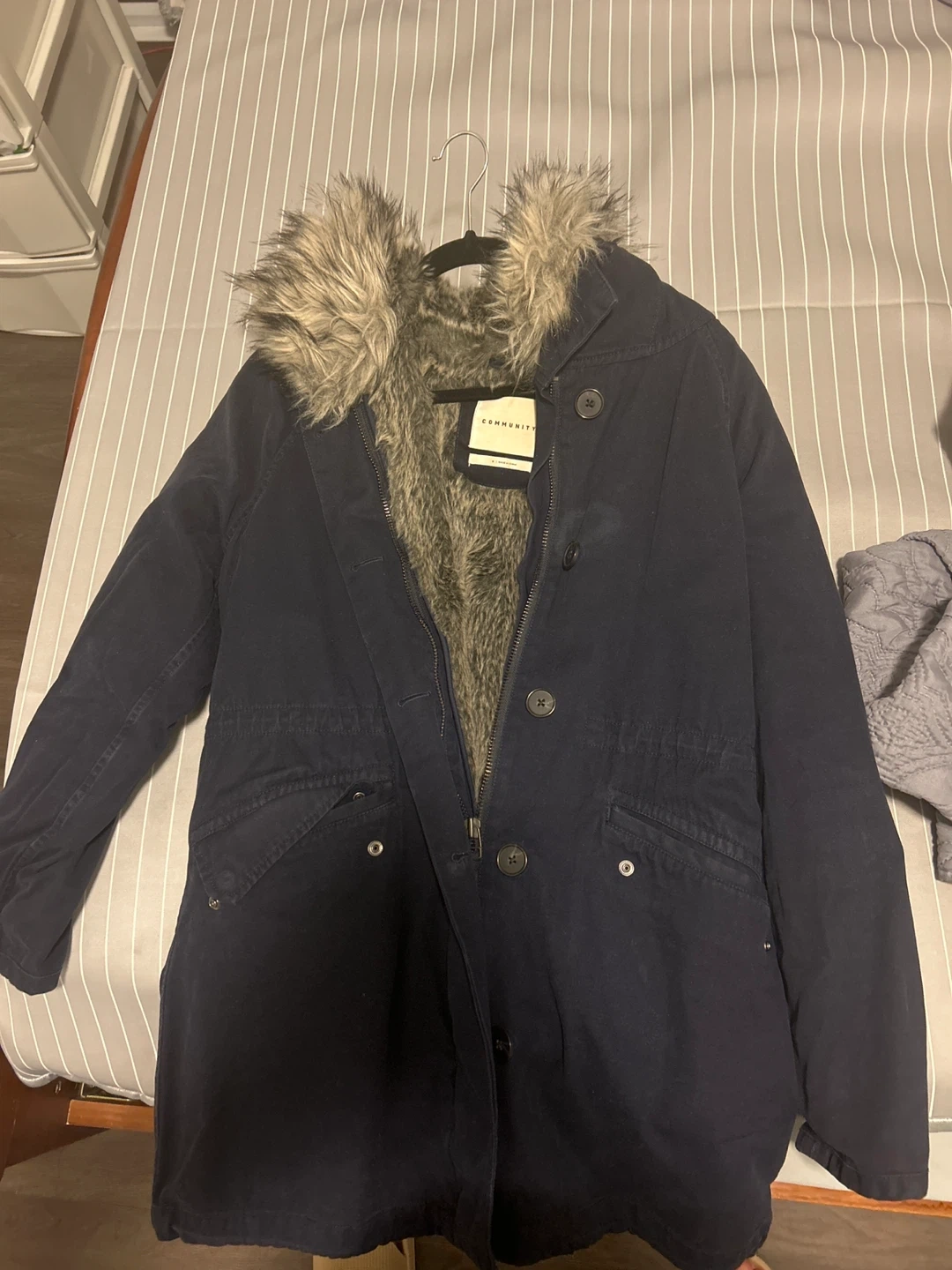 Here's a Community parka in navy blue. It has a faux fur trim and lining to keep you cozy during the colder months. It's in great condition and ready for a new home!