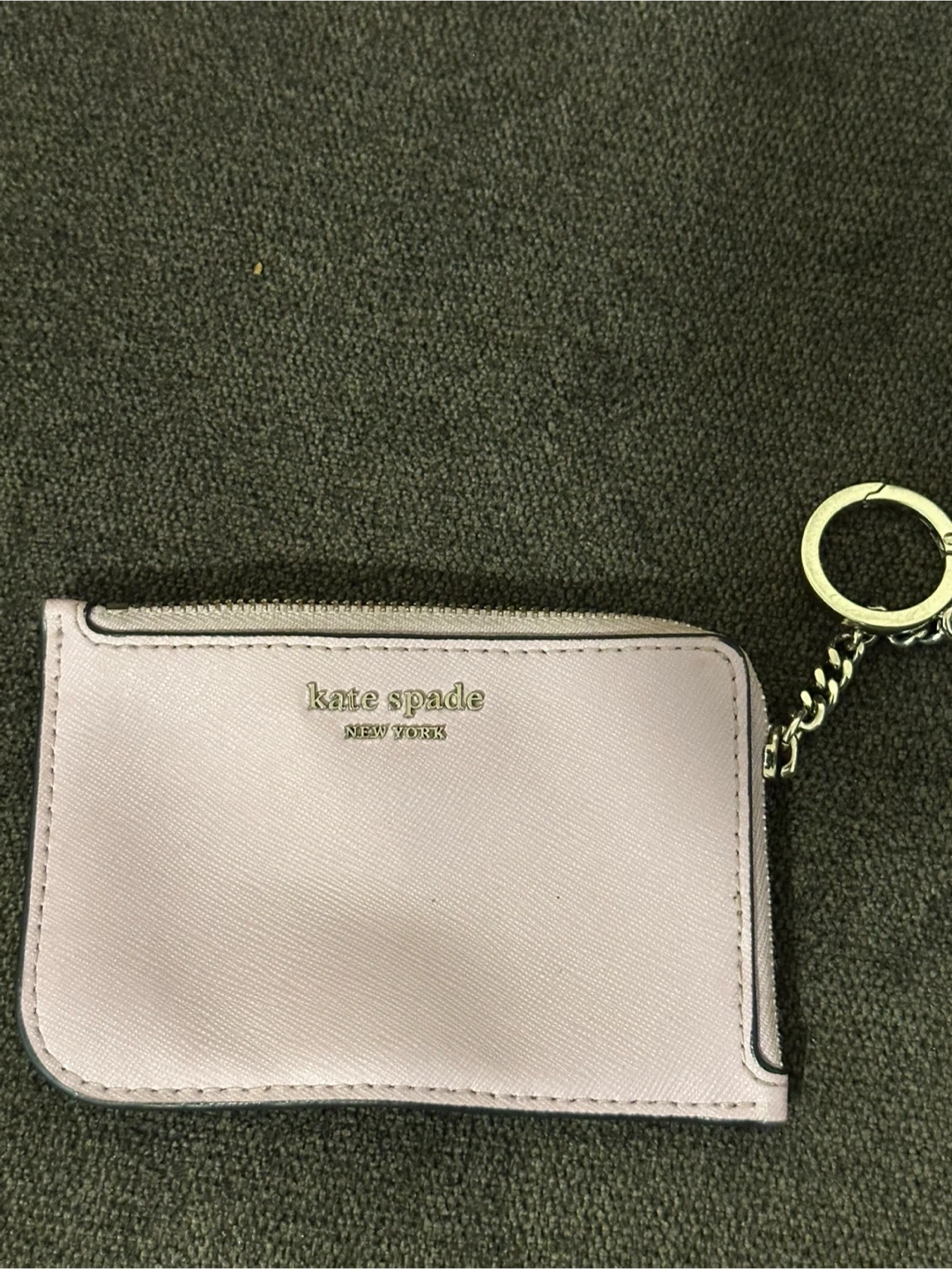 This is a Kate Spade New York card holder. It features a stylish design with a mix of light pink and dark blue. It's perfect for keeping your cards organized and easily accessible! It also has a convenient zipper.