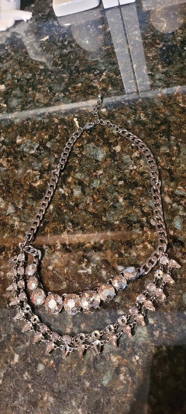 1000+Selling a pretty silver-tone layered necklace! It features a chain link style at the top and two layers of sparkly stones, one with round stones and the other with drop-shaped stones. It's in great condition and ready to add some sparkle to your outfit some stones missing as per pic good for repurposing - jewelry making Yonge and Finch area